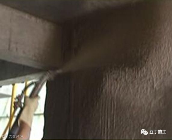 4)墙体扫浆;喷涂时,将浆料以圆点、网状形式均匀覆盖基层,形成的喷浆点高度应为1~3mm,圆点底部直径 2~5mm。喷涂应均匀,对喷射不均匀的部位应进行二次喷射处理。