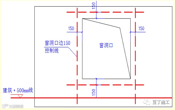5.3 墙面抹灰完成后,应在墙体上弹建筑﹢500mm线,窗洞口应根据外墙立面排版及建筑﹢500mm线弹窗洞口收边控制线,控制线距抹灰完成后窗边150mm。一般窗洞口长宽比窗框尺寸大10mm。