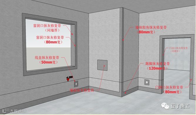 7.20 内墙抹灰完成后,如设计无内墙批白,应在如下部位做内墙抹灰修饰带或修饰块:
