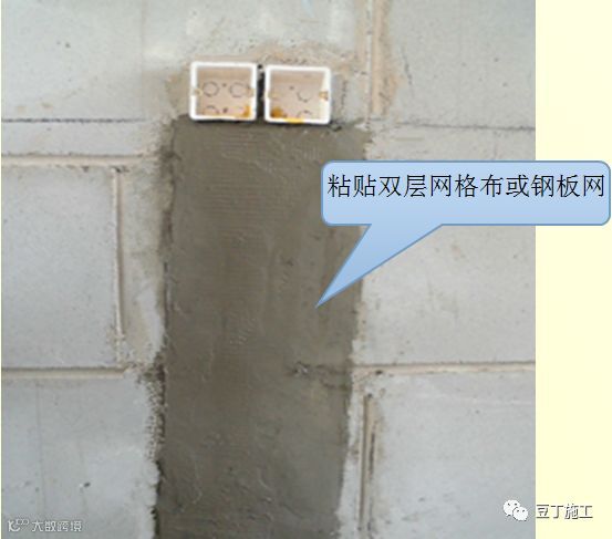 6.7 管线槽浇水湿润后,用砂浆嵌填抹压密实,然后素水泥胶浆粘贴两层玻纤网格布或钢板网。