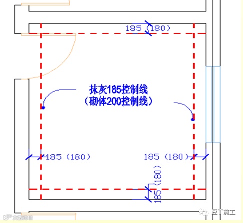 5.1 抹灰控制线要求:利用砌体或主体结构的200控制线,作为抹灰的185(180)控制线,如缺失或不清晰,应补充弹线。