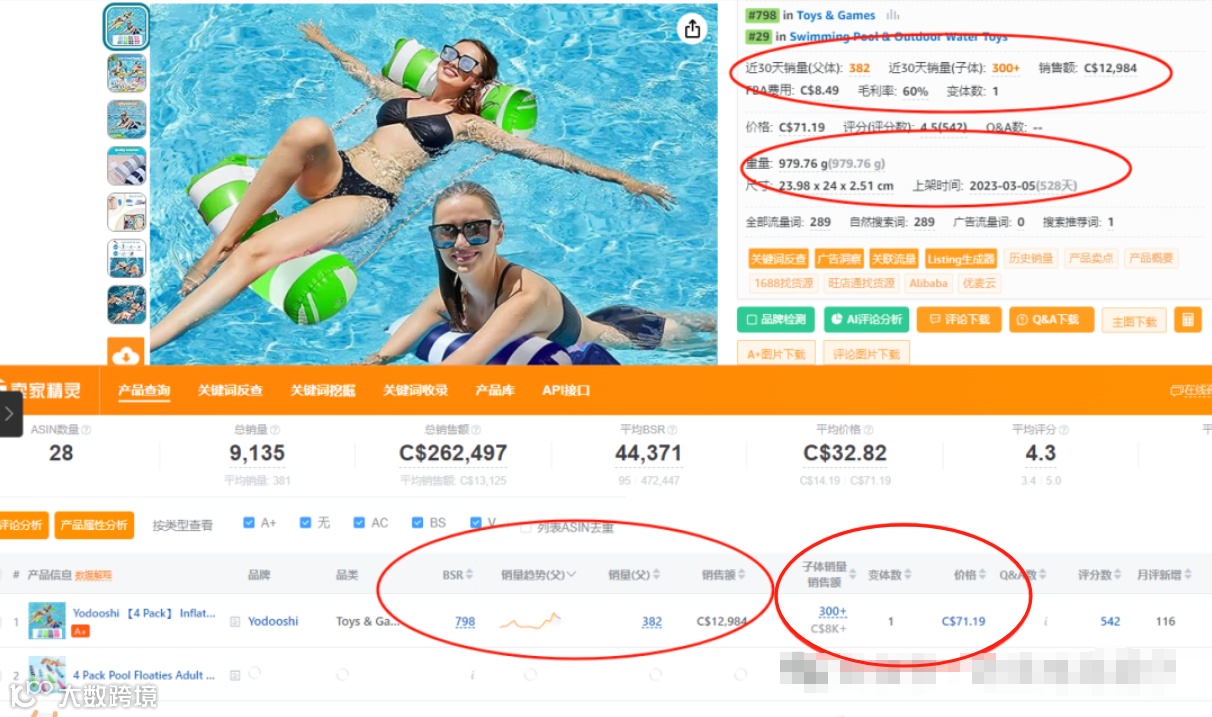 单量:在卖家精灵中显示上架时间是2023年03年05号,目前为止持续销售528天,30天销售量父体(382),子体销量(300+)