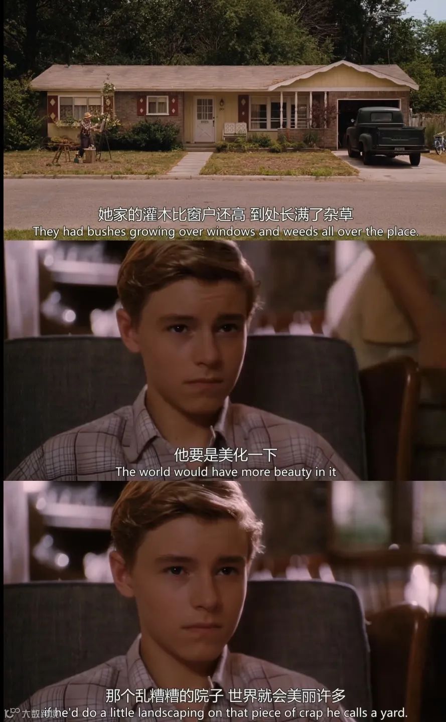 尽管电影剧情带有浪漫喜剧化色彩,但其内容和细节悄悄映射出美国人的社会潜意识:即院子、草坪是家庭高生活质量的象征,庭院=门面。庭院整洁有序则代表家庭经济富余,能负担多余的人工修整庭院费用。