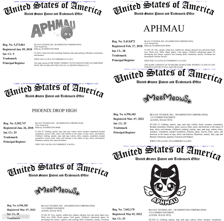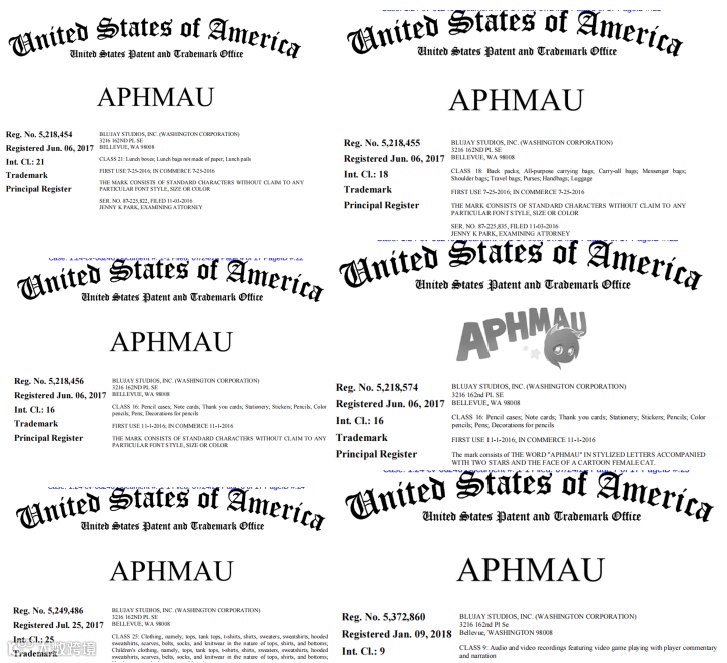 APHMAU、MeeMeows等商标注册在多个类目: