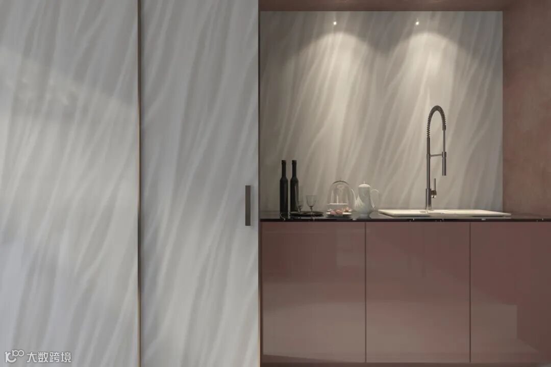 简洁线条搭配布纹肌理,消弭了现代厨房的冷硬。橱柜门板那独特的布纹,似有若无的纹理,是低调的奢华,为高效便捷的烹饪空间,增添一抹柔软的格调。