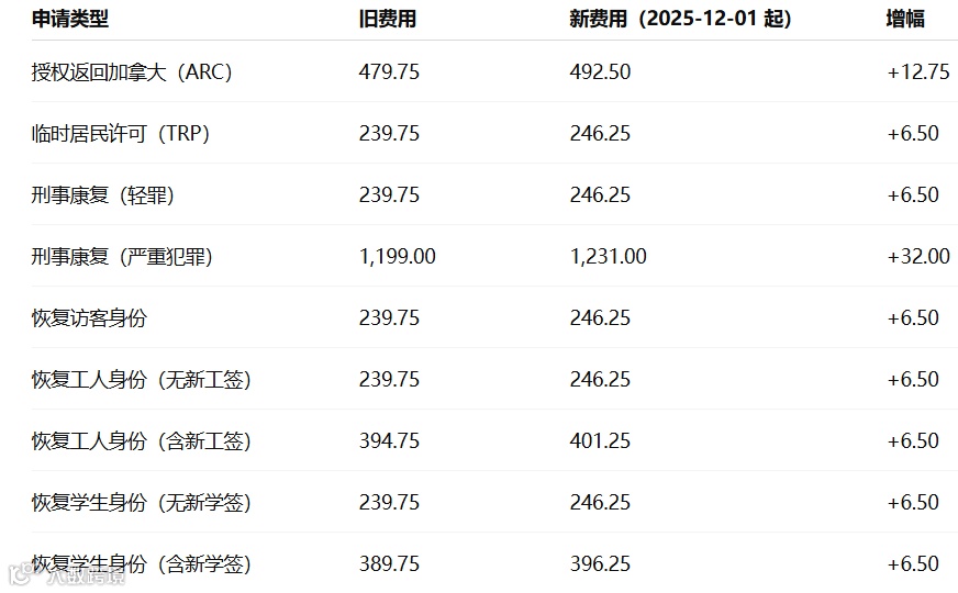 下面是官方 IRCC 公布的 旧费 vs 新费对照表(单位:加元 CAD):