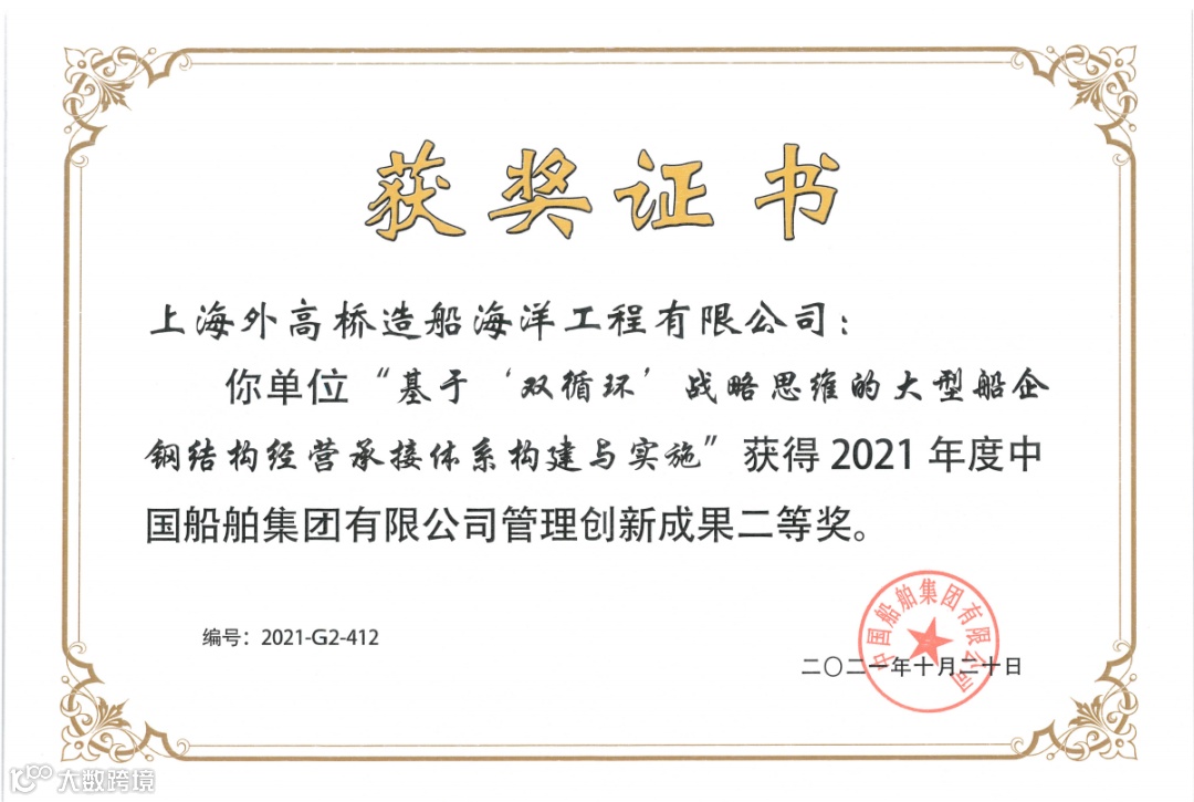 公司《基于“双循环”战略思维的大型船企钢结构经营承接体系构建与实施》项目,喜获中国船舶集团有限公司2021年度现代企业管理创新成果二等奖。
