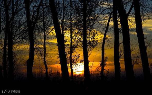 点评:漂亮的落日景象非常出彩。排列整齐的树干形成具有剪影效果的前景,也起到了围框构图的作用,透过树干空隙,展现的是日落的天空与地面景象。画面因为色温较低,呈现暖红色调,与蓝天和暗部形成鲜明的明暗对比。画面高光居中,显得稳重大气。不足之处是暗部太暗,可以通过后期略微提升一下细节,以不死黑为标准即可。电线对画面也略有影响。(因原片为JPG,暗部细节无法后期提升),构图上可以裁切掉一部分,留五分之一左右为好。如下图: