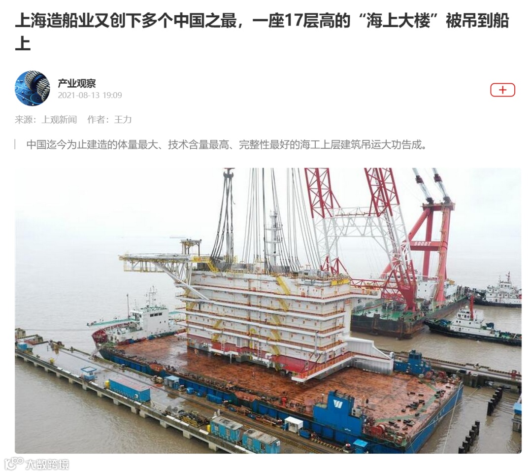 上海造船业又创下多个中国之最,一座17层高的“海上大楼”被吊到船上