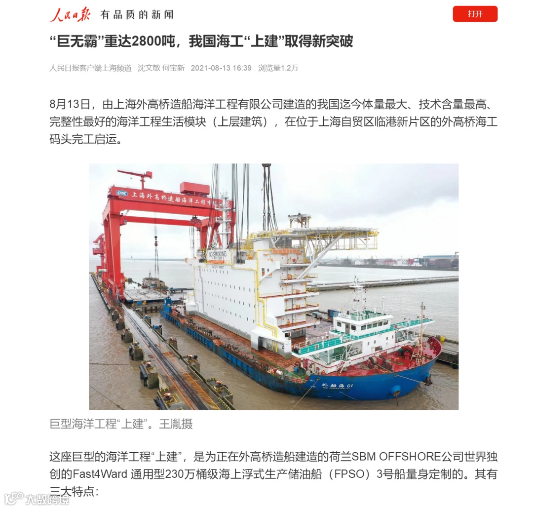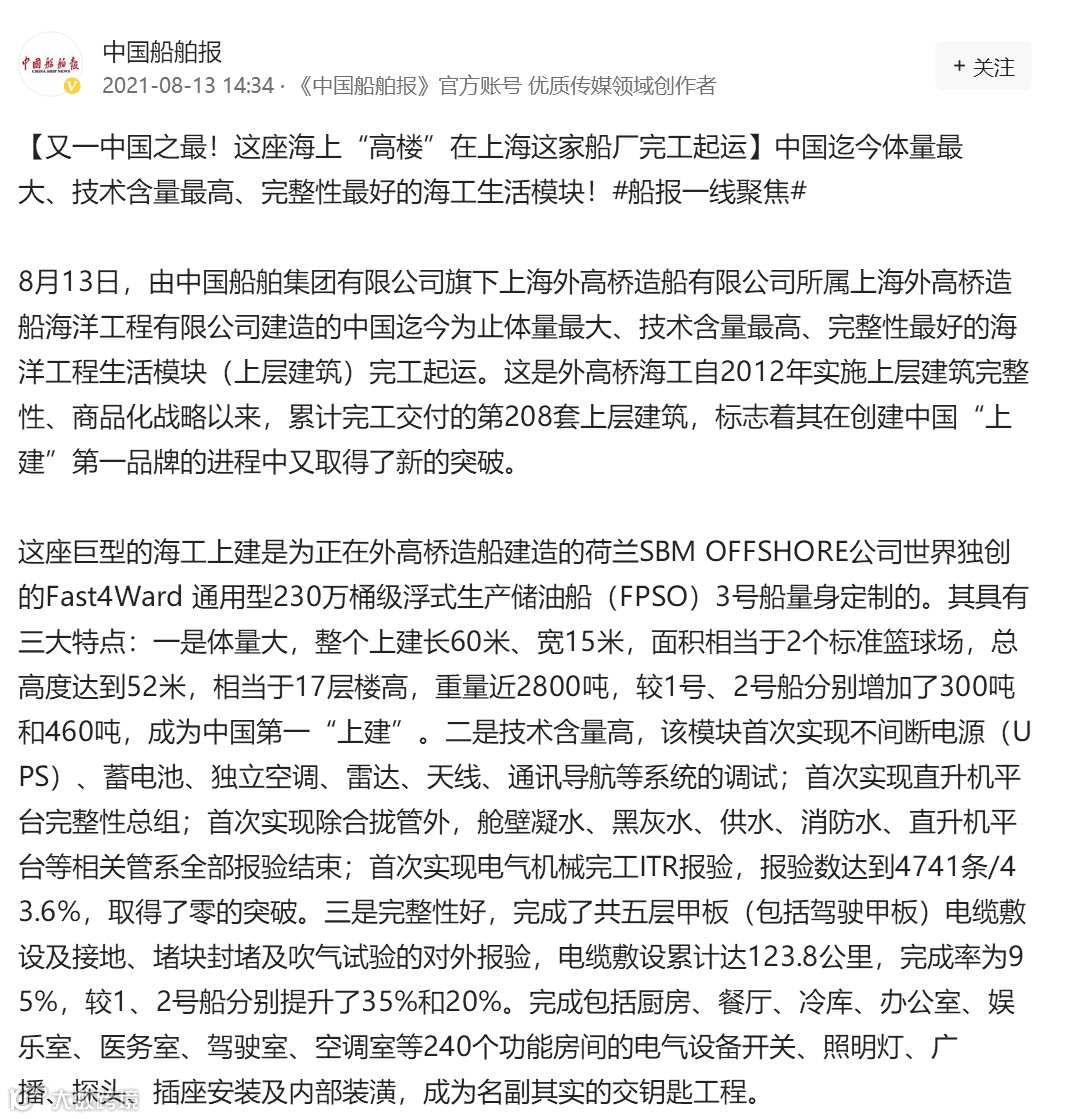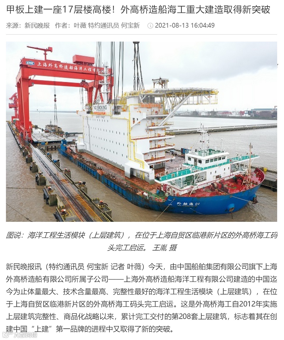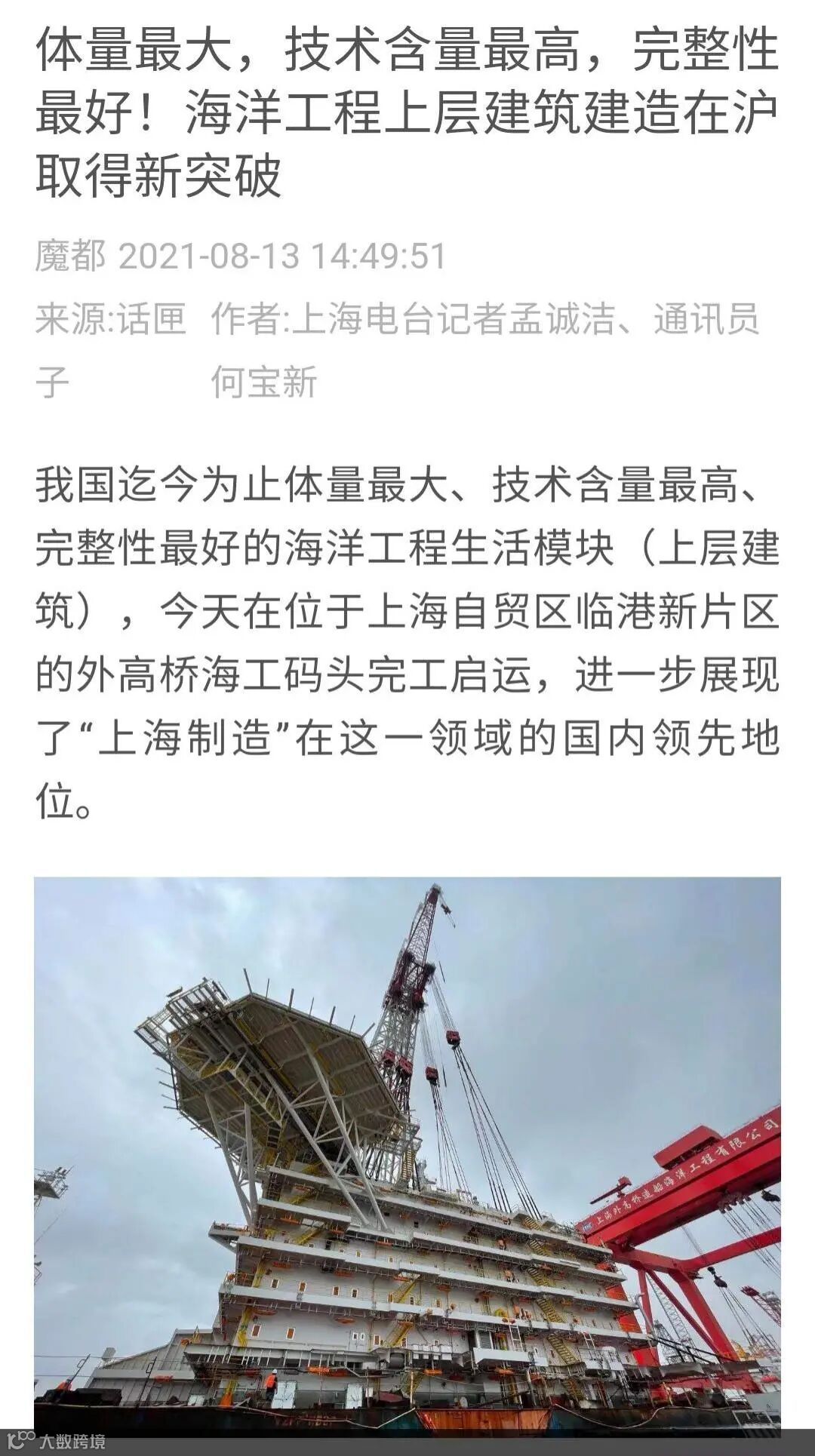 体量最大,技术含量最高,完整性最好!海洋工程上层建筑建造在沪取得新突破