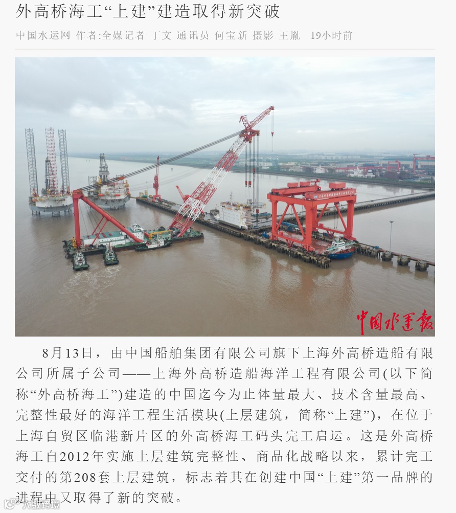 8月13日,由公司建造的我国迄今体量最大、技术含量最高、完整性最好的海洋工程生活模块(上层建筑),在公司码头完工启运,创造了我国“上建”建造、吊运新的纪录。