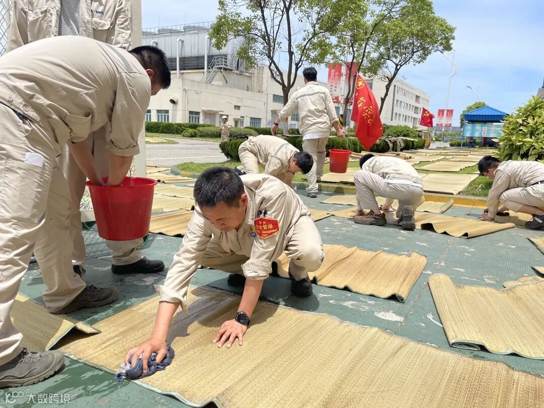 参与本次活动的青年员工人员涵盖部门各科室、作业区,参与人数达到二十余人。利用午休时间,头顶正午的烈日,大家紧张、忙碌地开展起了凉席清洁晾晒工作。经过一个小时的努力,近两百张经过擦洗和晾晒的凉席被重新整理、分组并有序摆放,为后续分发至每个工人做好充足的准备工作。