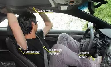 逃生时,不要急于解开安全带,需先调整好坐姿,双手先撑住车顶,双脚蹬住车两边,背臀紧贴座椅,待固定好坐姿后再一手解开安全带,慢慢放下身子以免受到第二次撞击。