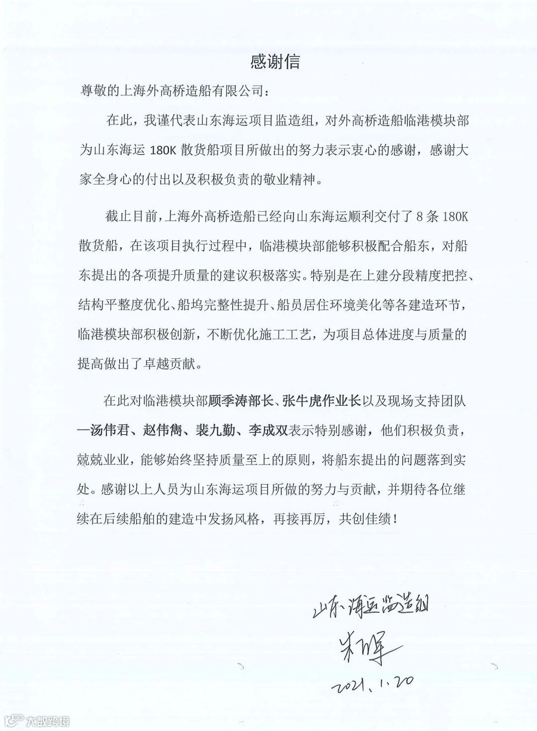 1月28日,模块部收到山东海运项目监造组感谢信,对模块部积极负责的敬业精神和质量至上的管理理念表示高度肯定,并对模块部部长顾季涛、舾装作业区作业长张牛虎及现场支持团队表示特别感谢。
