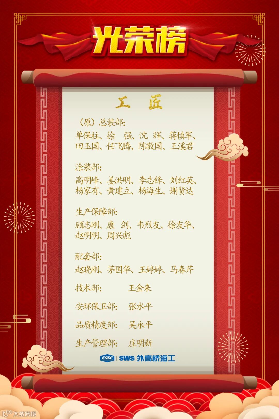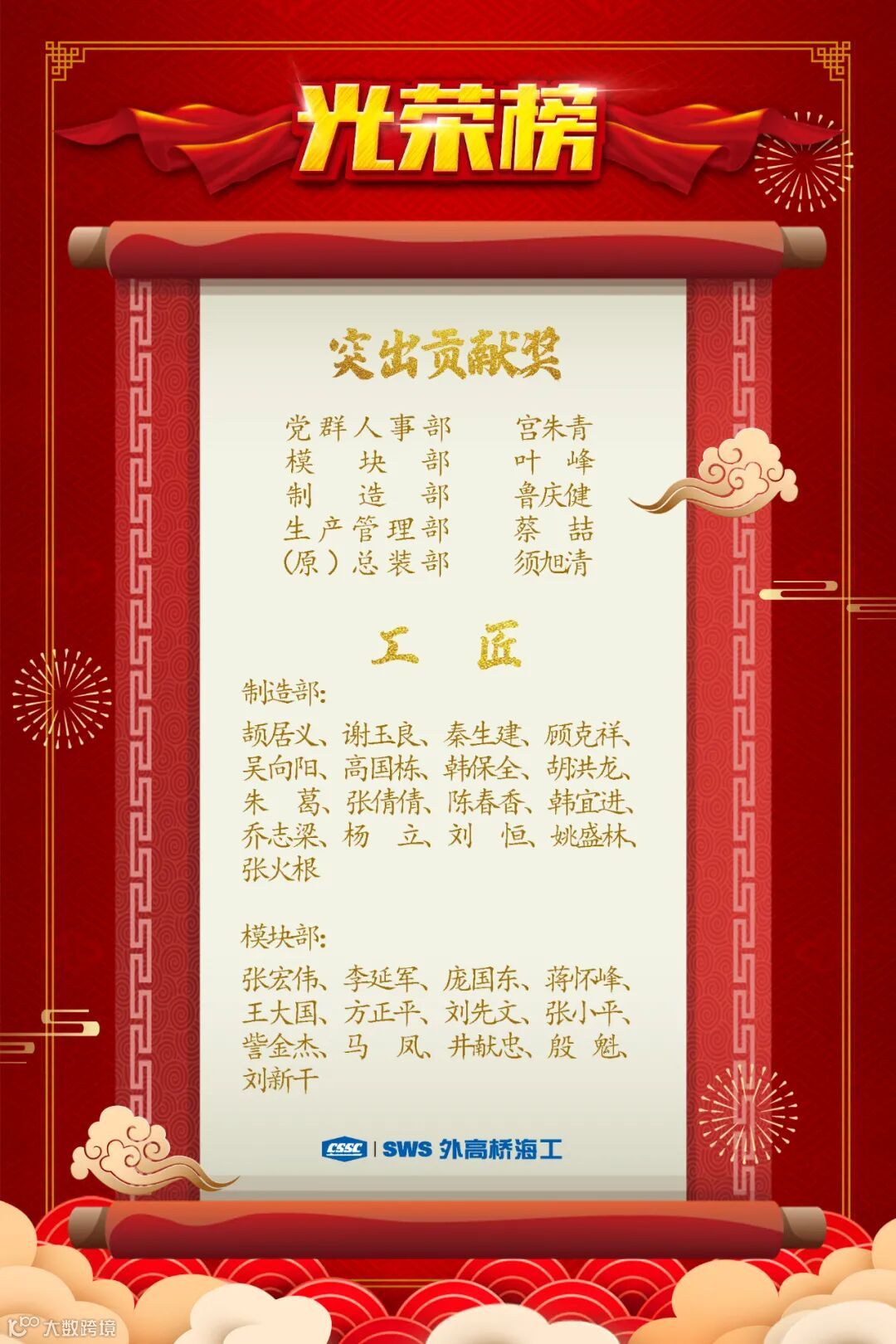 外高桥海工根据《上海外高桥造船海洋工程有限公司工匠及突出贡献奖评选方案》的要求,在各部门配合下,经公司评审核定及公示,授予以下65名职工2020年上半年度突出贡献奖及工匠的称号。