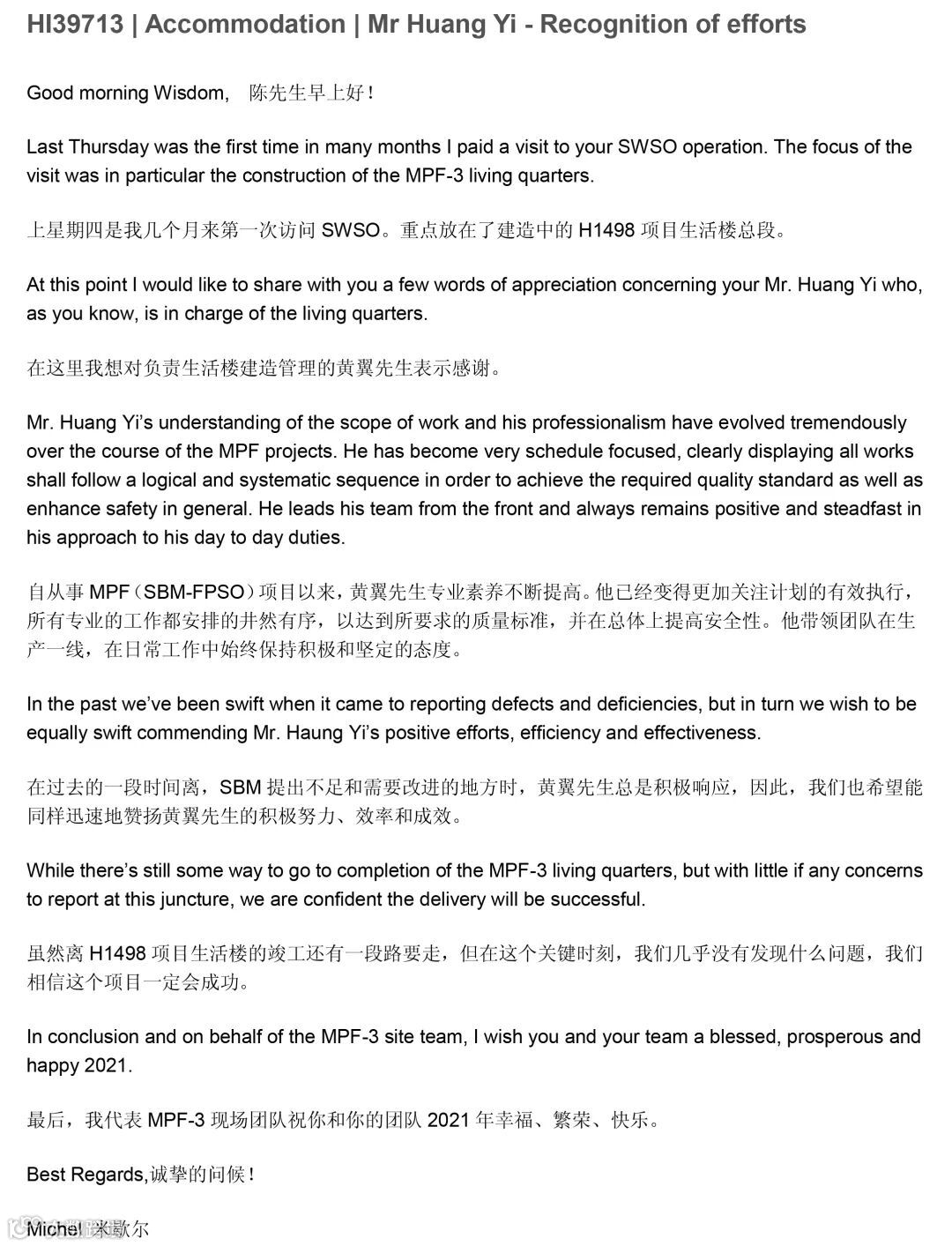1月5日,公司收到了来自荷兰SBM公司驻厂经理米歇尔先生发来的表扬信,对模块部副作业长黄翼及他的团队在FPSO三号船H1498上建生活楼项目中展现的卓越业务水平、管理能力和保持密切沟通的工作态度给予了高度的赞扬和肯定,并表示对该项目的推进充满信心。