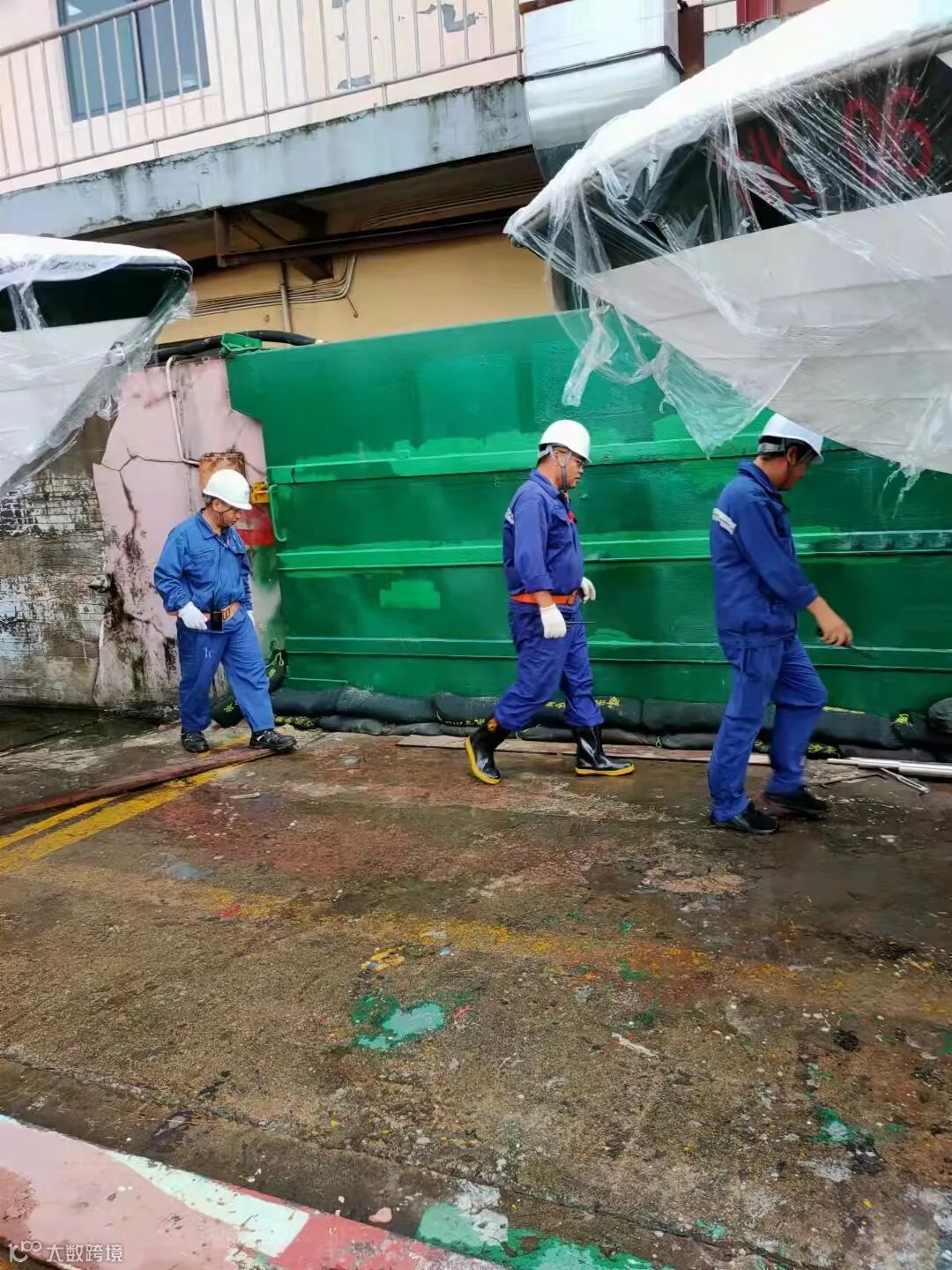 下午三时许,船舶工程部将所有码头靠泊船只缆绳完成加固,防汛门关闭结束,花兰螺丝拉紧到位,船坞应发备车正常。防汛门以外的动力气瓶,焊机,空压机等全部转移到防汛门以内安全区域;钢结构工程部完成在建三条80米趸船的防护,完成涂装房、冲砂房卷帘门的支撑保护,以防大风造成的物损;生产保障部调试好五台潜水泵,安放到地势低位集水井内,随时准备排水抗涝。安环部组织生保部、东泰物业等紧急充装防汛沙袋200余个,以备不时之需;技术