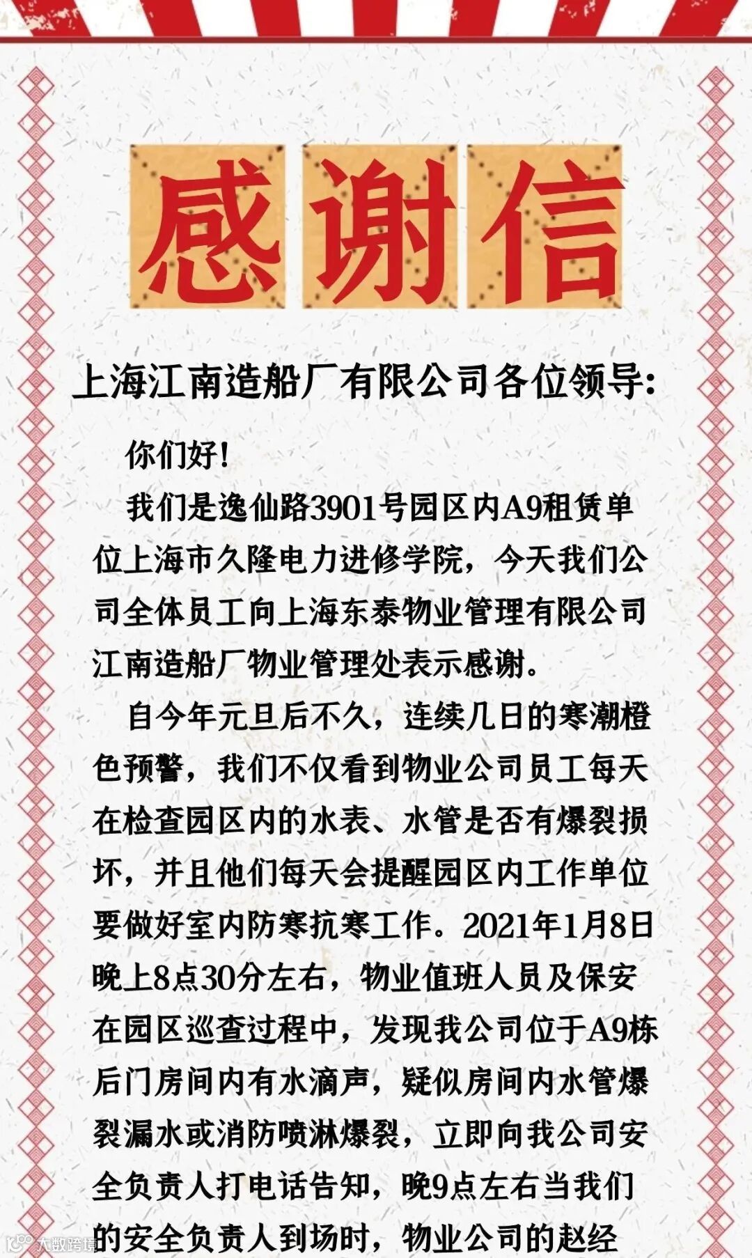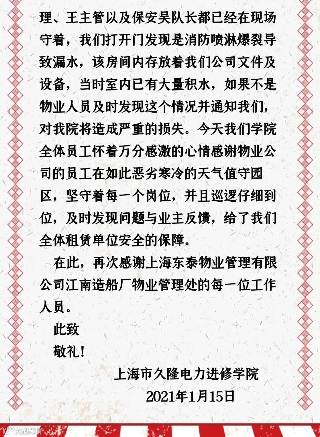 上海市久隆电力进修学院向我公司和物业递送感谢信
