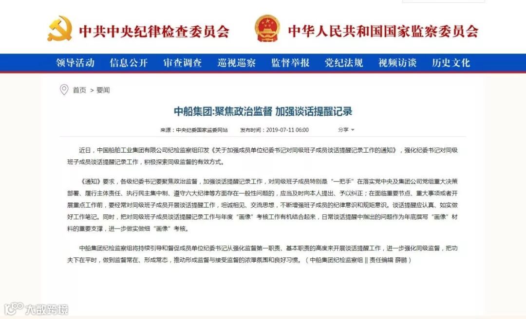 近日,中央纪委国家监委网站刊发《中船集团:聚焦政治监督 加强谈话提醒记录》。近年来,中船集团积极持续探索强化同级监督的有效方式, 今年把强化纪委书记对同级班子成员谈话提醒记录工作作为一项重要抓手,引导和督促成员单位纪委书记进一步强化同级监督,把功夫下在平时,做到监督常在、形成常态。