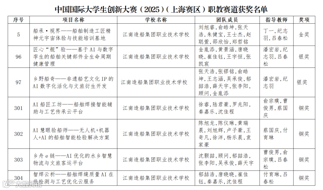 在中国国际大学生创新大赛(2025)上海赛区,我校表现卓越,获1金、2银、4铜及优秀组织奖,体现了学校扎根国家造船强国战略、培育复合型技能人才的成果。
