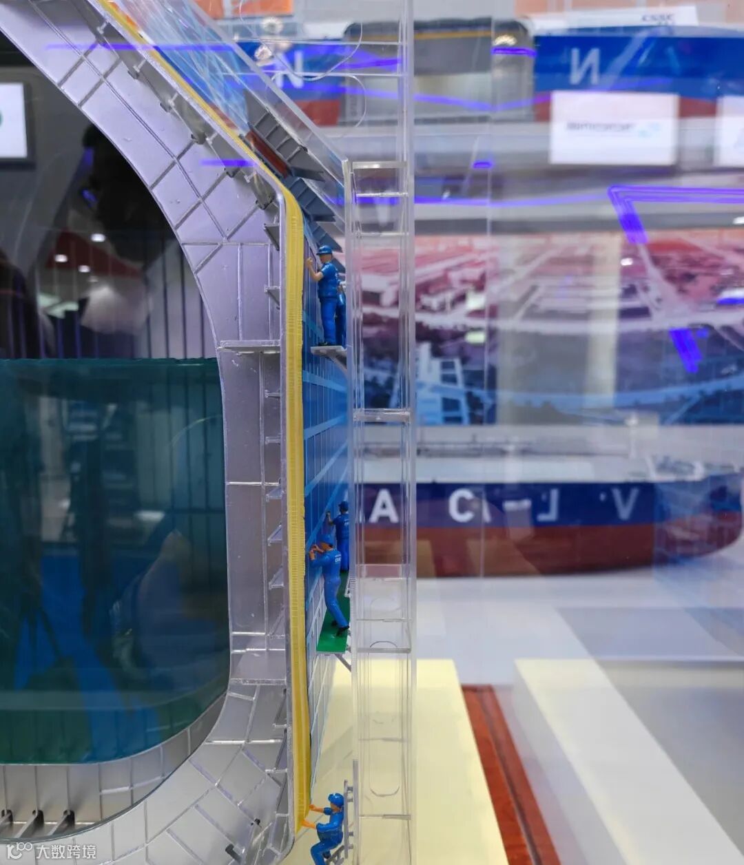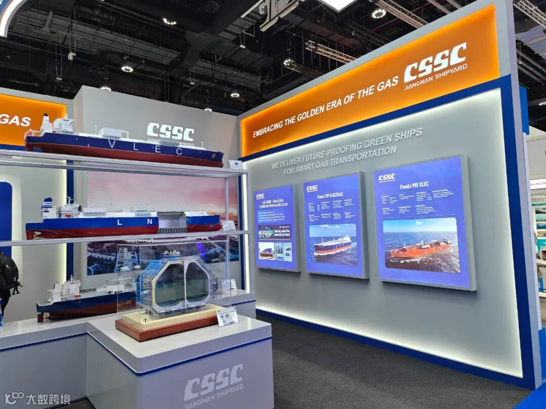 本次展会上,江南造船集中展示了多款经典船型产品,包括175,000立方米MARK III FLEX薄膜型LNG运输船、99,000立方米超大型乙烷乙烯运输船及93,000立方米超大型液氨运输船等。在展台核心区域,重点呈现了江南造船自主创新的第二代B型舱(BrillianceE® II),并配合播放了专题视频《BRILLIANCE® MADE CRYOGENIC TYPE B TANK GREAT AGAIN》,对其技术特点进行了系统介绍。该B型舱采用铝合金5083-O材料制造,可适配LNG等多种低温货物。现场模型直观演示了其支持部分装载的灵活特性,同时展现出液货舱外围设置的检修维护通道,突显了B型舱作为独立液货舱在可维护性方面的显著优势,吸引了大量专业观众驻足交流与咨询。