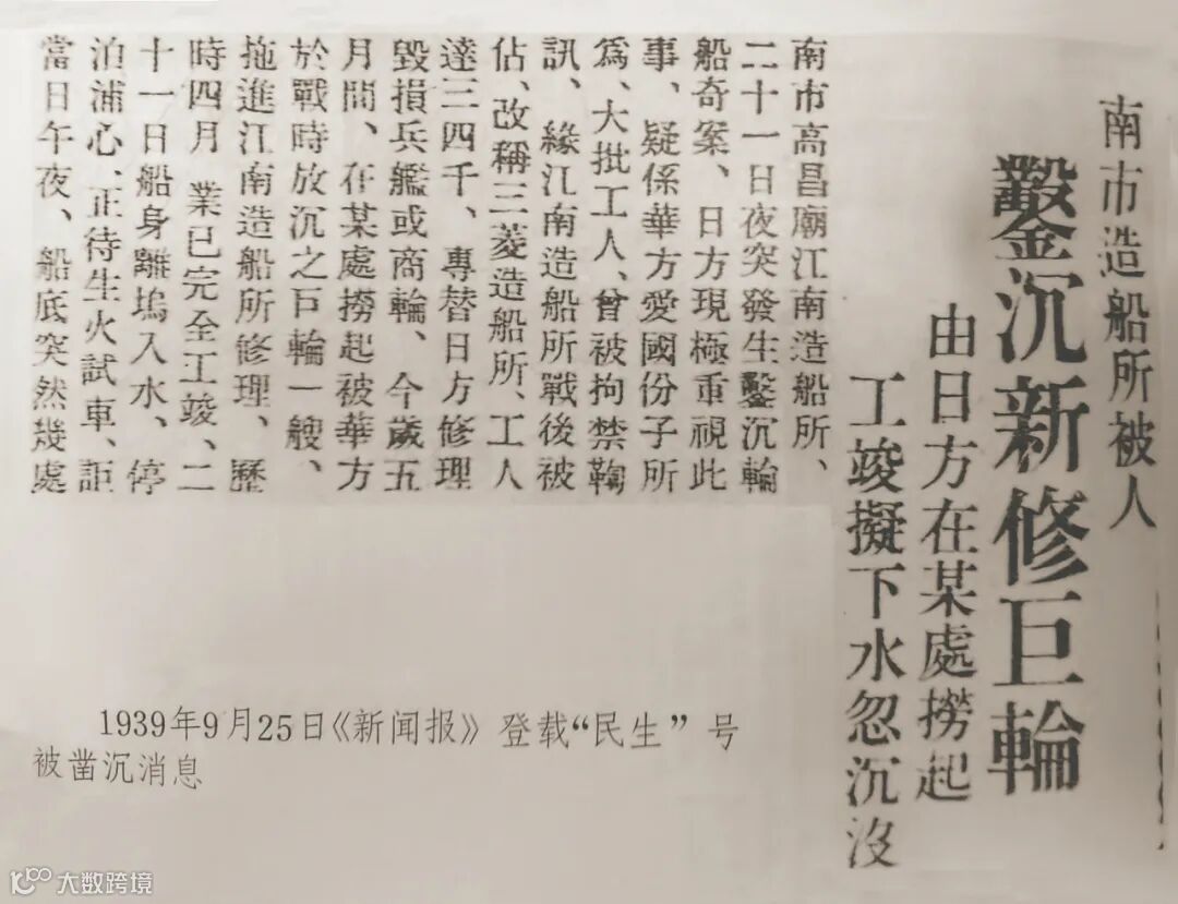 智沉“民生”舰。1939年,日军把中国海军武汉保卫战后自毁的“永绩”号和“民生”号两艘军舰打捞出水,拖到江南造船所修理,该船曾是江南建造的一艘浅水炮舰。江南工人孙增善向国民党海军部驻沪办事处刘武报告了这一信息,刘武对孙增善说:“这两舰修好后是用来屠杀中国同胞的,最好设法把它们沉掉。”9月中旬,“民生”号修复在即。孙增善在工友张根宝的配合下,于9月21日夜里只身潜入“民生”号将其凿沉。一艘排水量500吨的军舰在日军的守护下突然沉入黄浦江底,在上海成为引起轰动一时的事件。当时《申报》有较详尽的报道:“21日夜,江南造船所突发生凿沉轮船奇案,日方极为重视,大批工人被拘询。缘日方在某处捞起巨轮一艘,拖进江南厂修理,为时四月,已完全完工,二十一日停泊江心,正待升火,船底孔几处冒水,无法堵塞,船身旋即下沉。”同日的《新闻报》对此事也有报道,并说:“此奇案‘疑系华方爱国分子所为’。”这是江南人抗击日本侵略者的又一杰作。