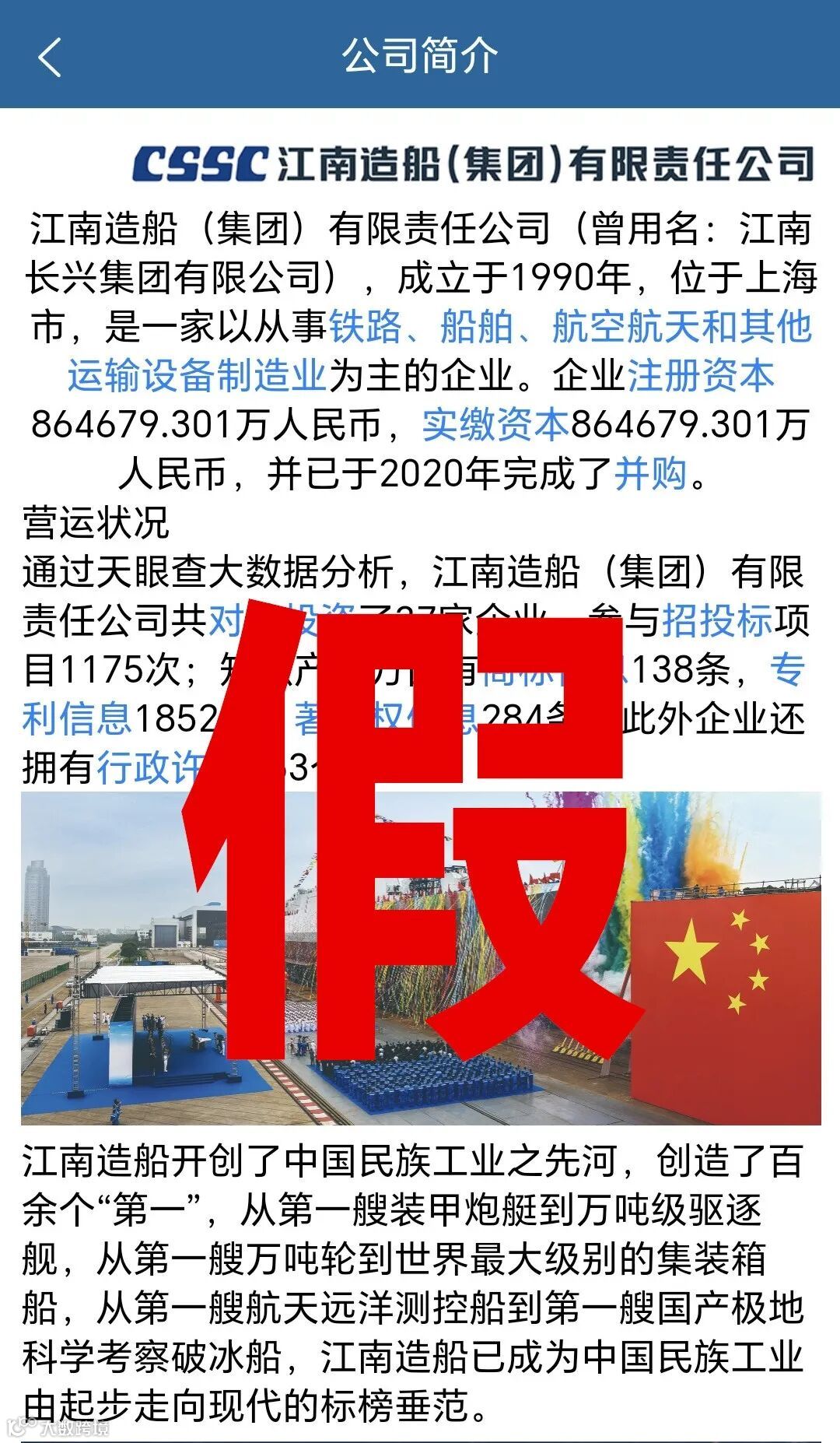 我司在此郑重声明,江南造船官方并无“百年江南”相关的任何股权投资事宜,也从未通过APP、微信、QQ等方式吸引股权投资。我司审阅了后台收到的图片,包括企业介绍、相关文件等,发现内容均为伪造。请大家保持警惕,提高防范意识,谨防上当受骗。