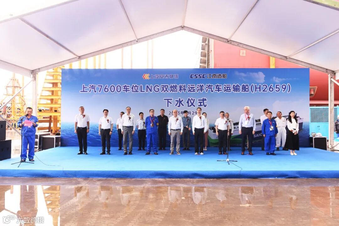 上汽集团移动出行与服务事业部副总经理(主持)王泽民,上汽安吉物流股份有限公司总经理金麒、副总经理忻坚敏,挪威船级社大中华区技术总经理Pettersen oyvind,中国船级社上海分社副总经理郭建军,中国船级社实业有限公司副总经理兼上海分公司总经理刘仲源,上海船舶研究设计院院长吕智勇、中船贸易船海业务三部副总经理赖丽华,公司副总经理张俭、资深专家张申宁等出席下水仪式。