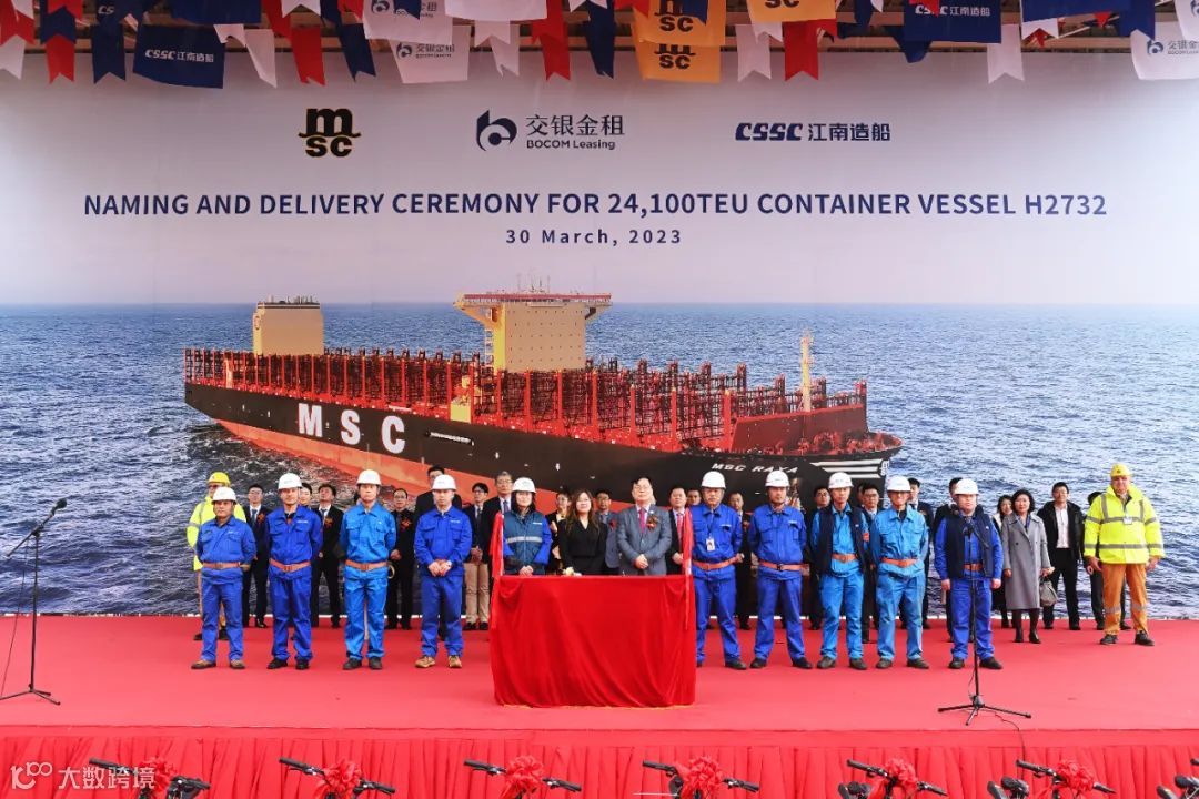 在仪式现场,船东MSC为表达对建造团队的肯定与感谢,现场向江南的优秀员工代表赠予了10辆自行车。