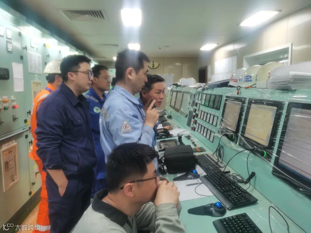 4月2日凌晨一点半,研究院胡楠开始着手准备操纵性能试验,凌晨两点一刻,准备就绪指令下达,开始了燃油模式下的急停和惯性试验。三个小时试验顺利结束,燃油模式转燃气模式,开启液化气船中首次在燃气模式进行的EEDI测速试验,这样的实验条件对机舱运行状态要求更苛刻,需要始终保持在燃气模式下进行。所以当试验进行四小时,准备掉头进行下一轮试验时,主机突然从燃气模式跳转到燃油模式,试验条件的突变让大家的心都“提”起来了。