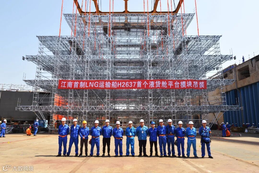 9月7日上午,中国船舶集团所属江南造船为广东九丰能源集团建造的79800立方米液化天然气运输船(LNG)液货舱首舱平台模块吊装顺利结束。单个模块共计128根圆管接口,实现精准对接、一次落位,整体精度及变形控制取得预期效果,为后续平台模块快速吊装打下基础。