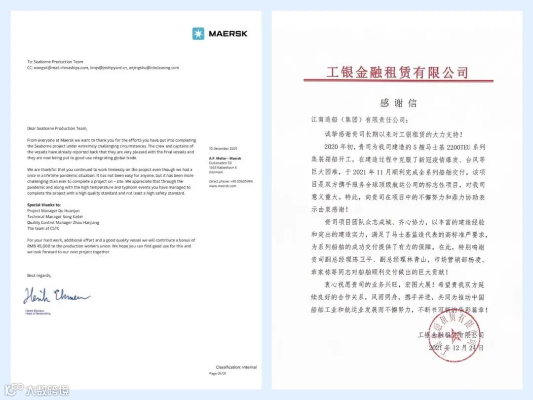 马士基&工银租赁感谢信(2200TEU支线箱船)