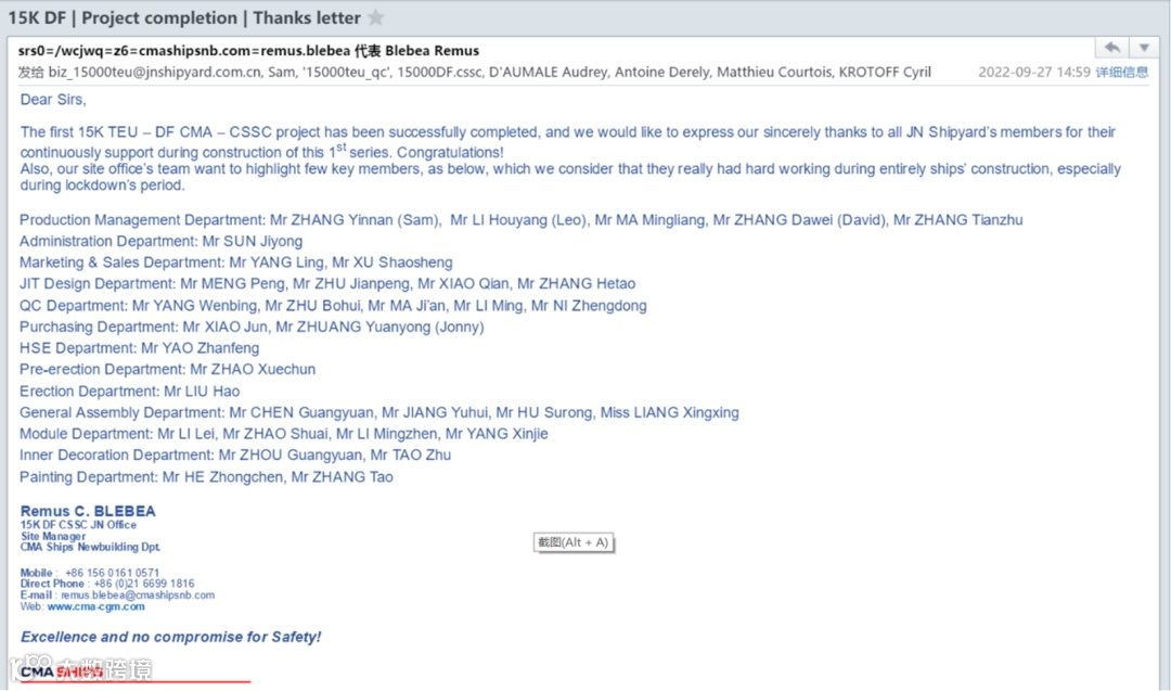 同时,我们(达飞)驻厂团队想特别感谢贵司以下表现突出的员工,我们认为他们在整个项目的建造过程特别是在疫情封锁期间,真的付出了巨大的努力。