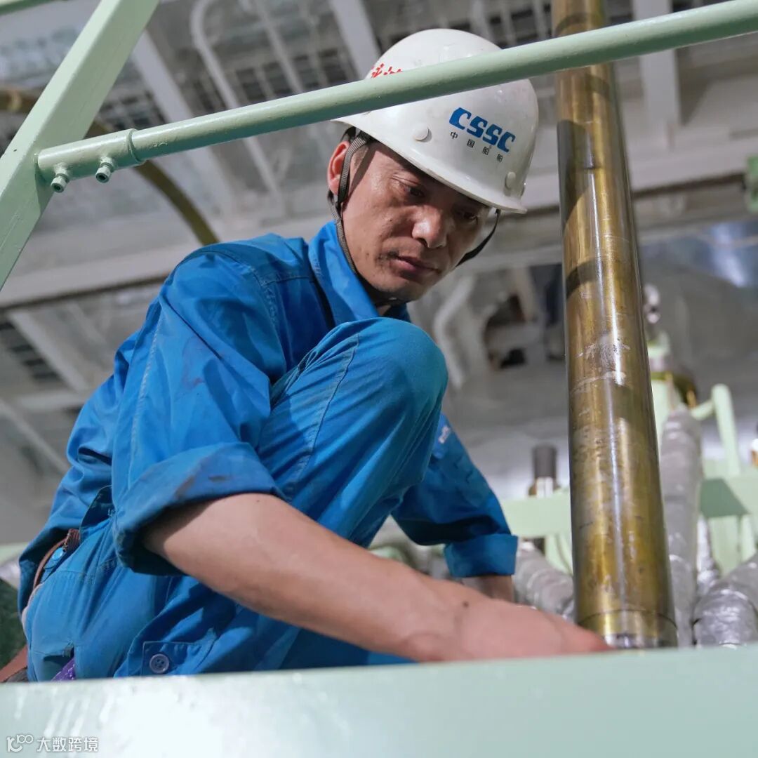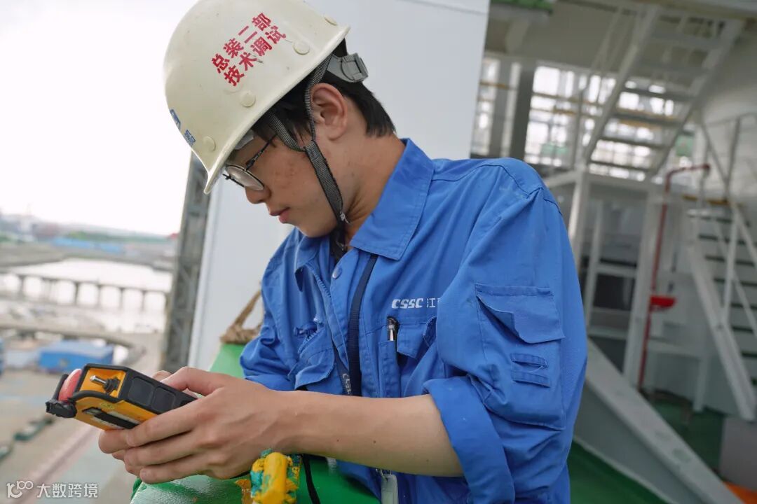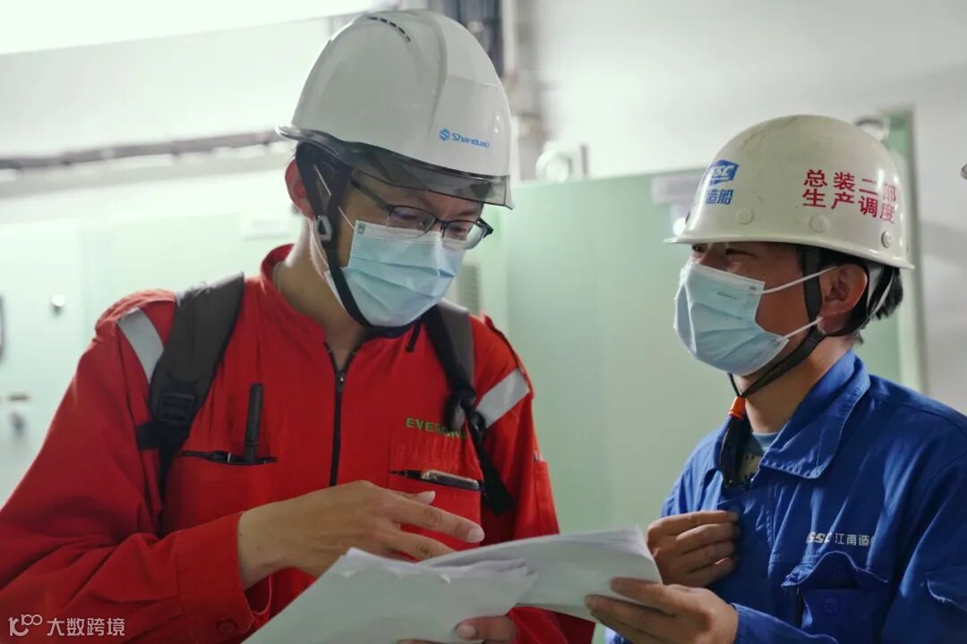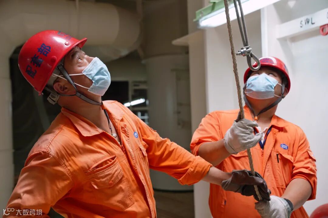 配套部机电设备作业区肖欢、范志耀在摆放到位交船备件
