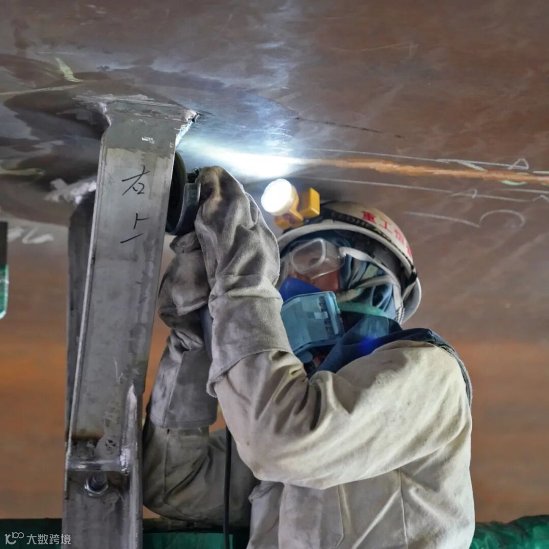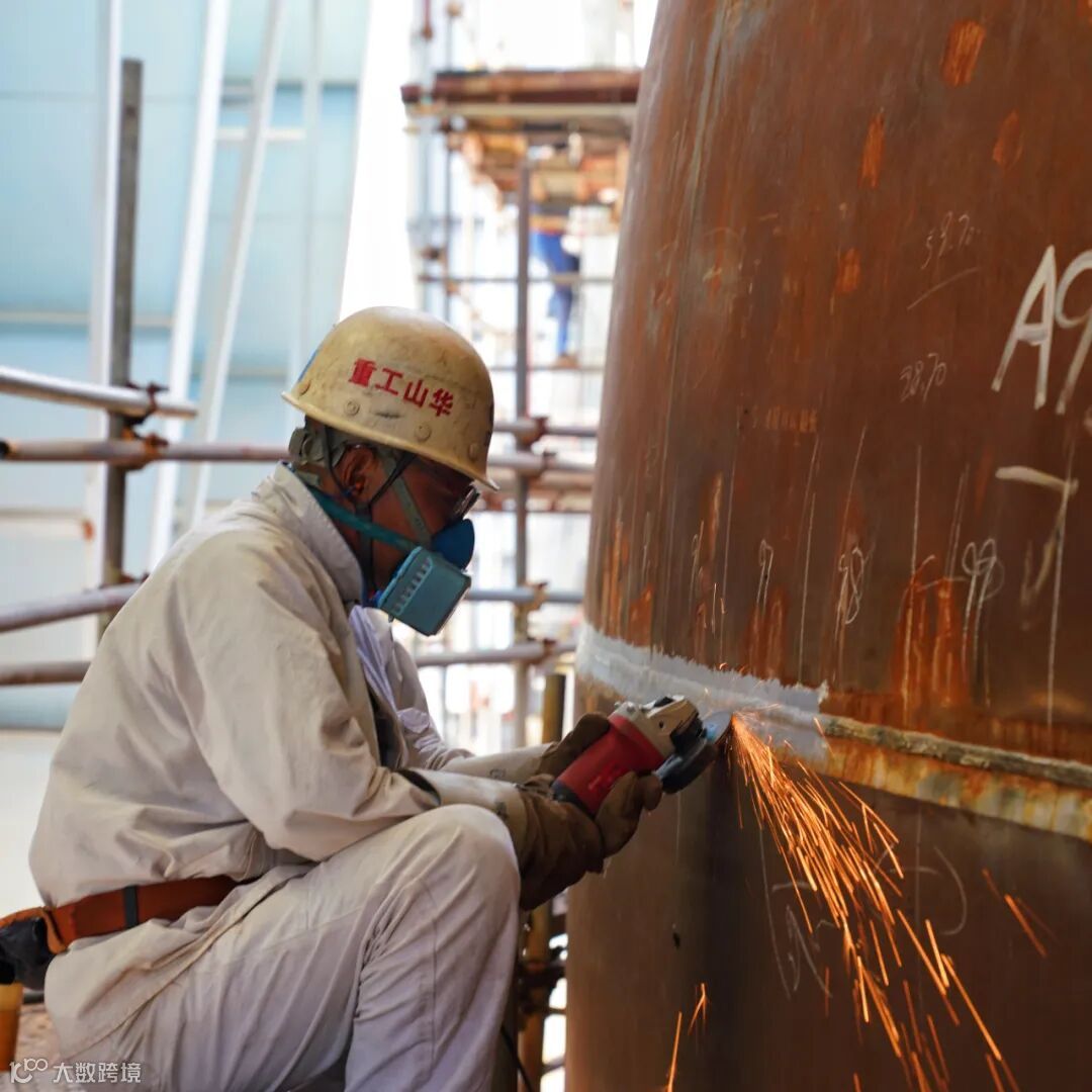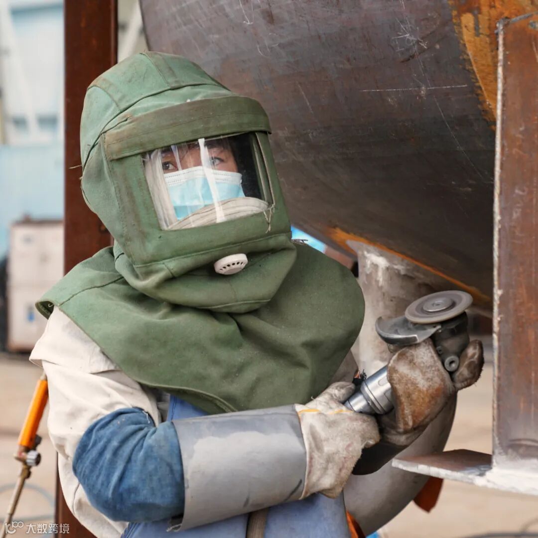 江南重工山华公司欧士芹在进行横焊缝打磨工作。
