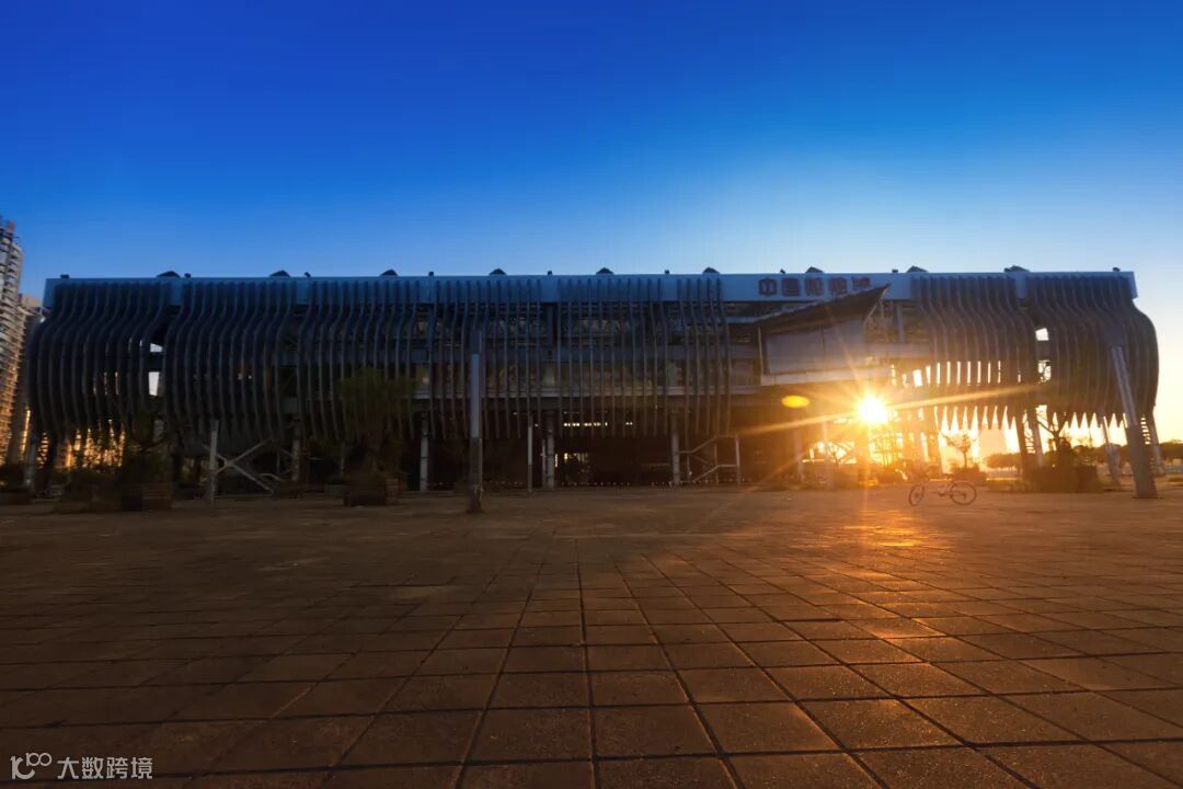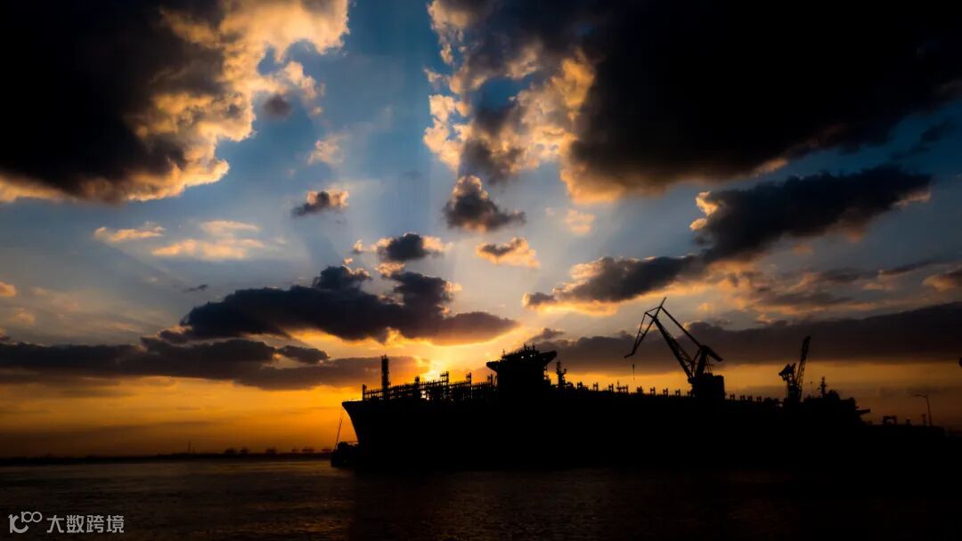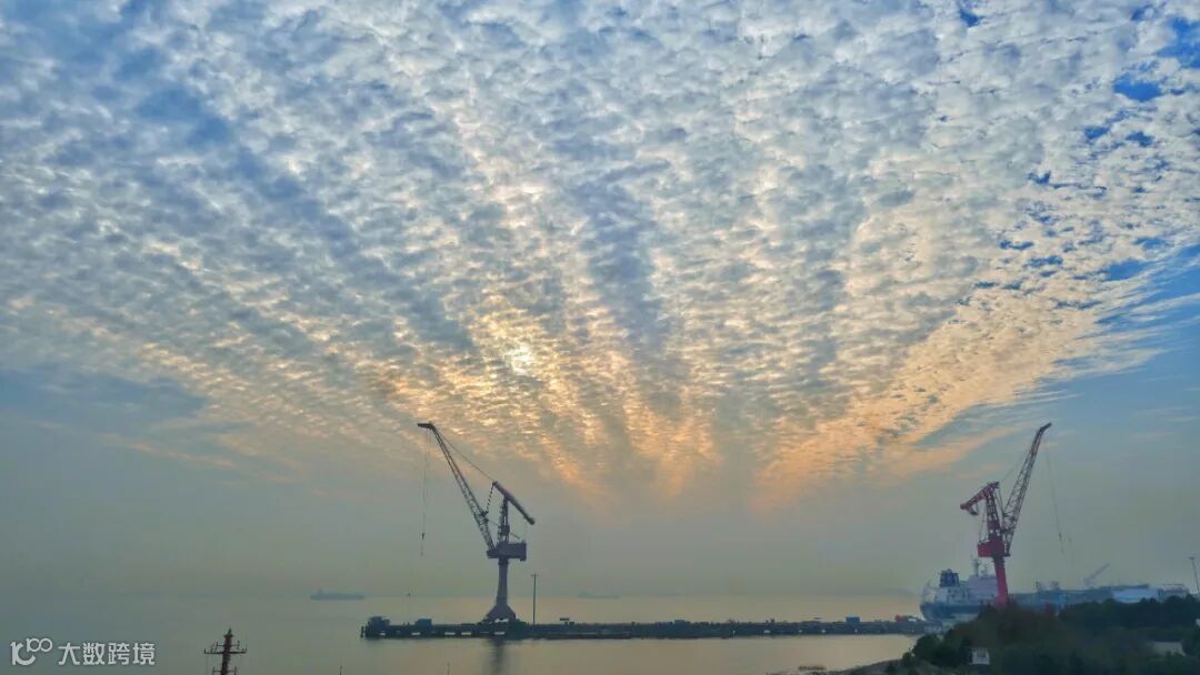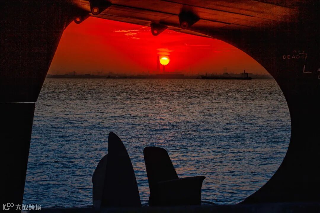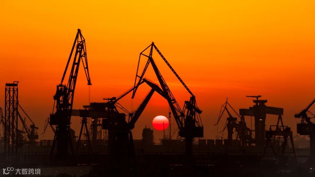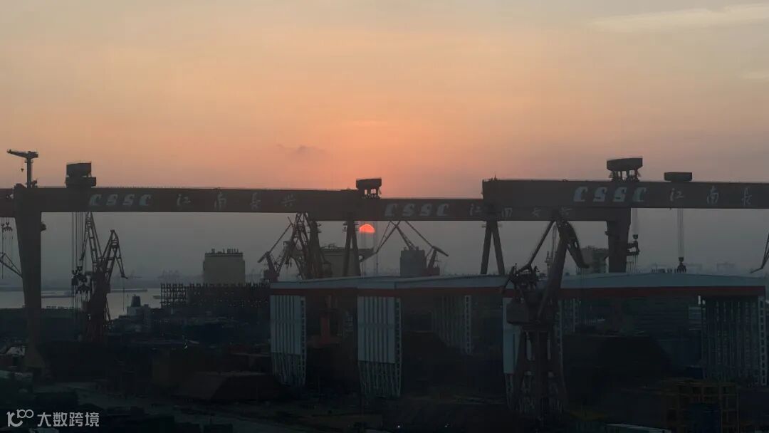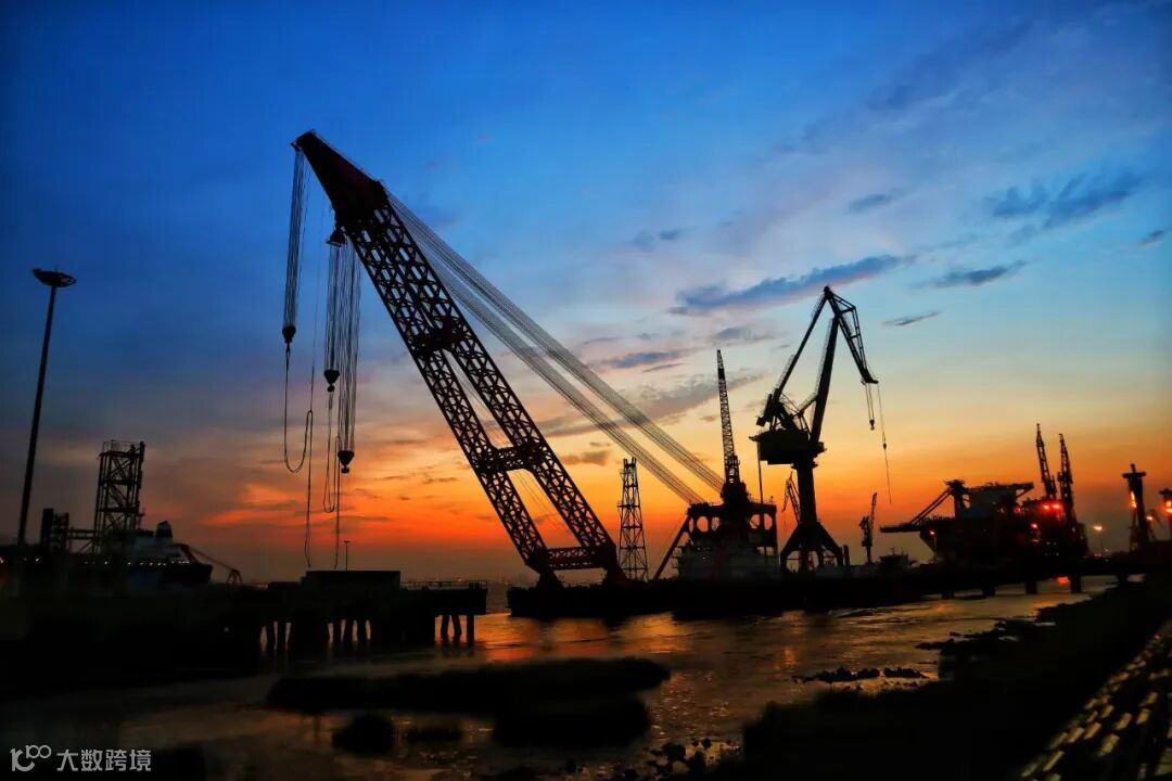 日落时分,阳光下的吊车、船舶、海面、建筑群五彩斑斓
