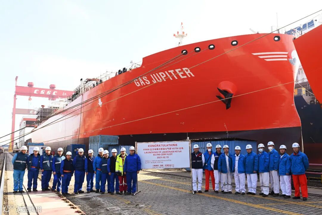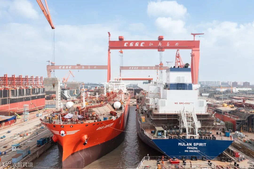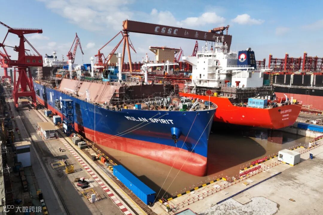 2月15日,在4号坞率先出坞的是江南造船为广东九丰能源集团有限公司建造的国内首制79800立方米Mark III型薄膜式液化天然气(LNG)运输船,以及为天津西南海运有限公司建造的93000立方米超大型液化气船(VLGC)首制船;同时起浮的还有93000立方米VLGC后续半船和即将移位至3号坞的24100TEU超大型集装箱船的艏部巨型环段。