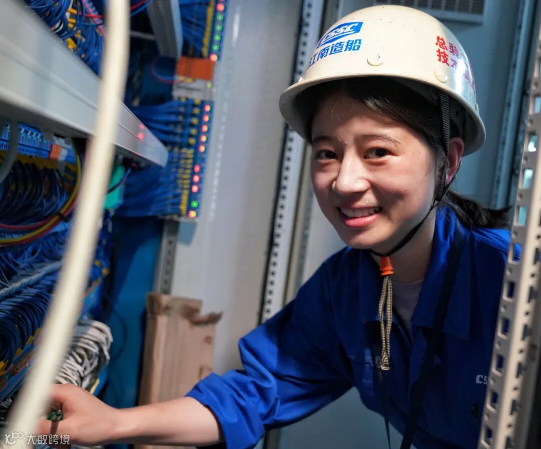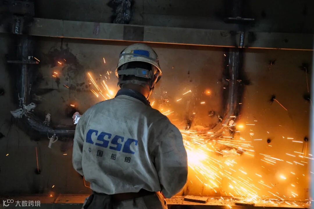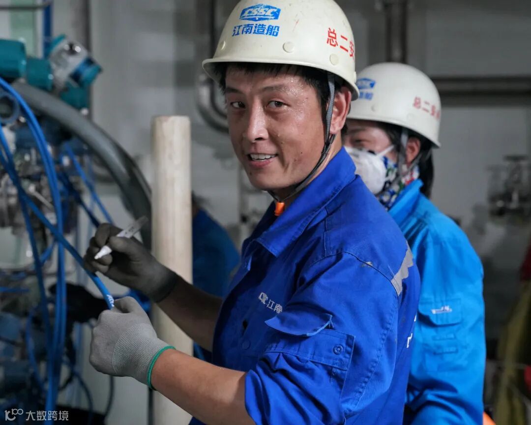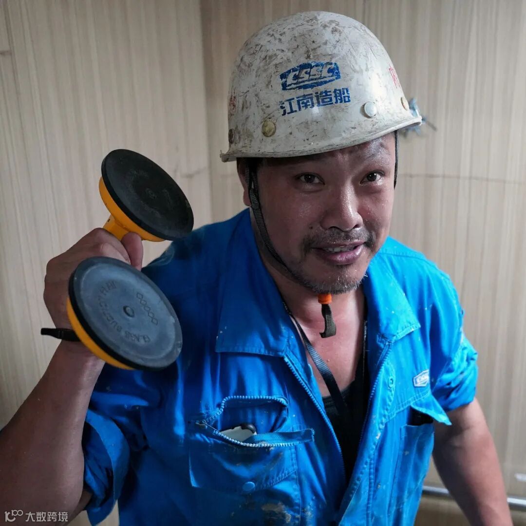 内装部内舾装一作业区魏从祥在进行楼梯间顶板安装