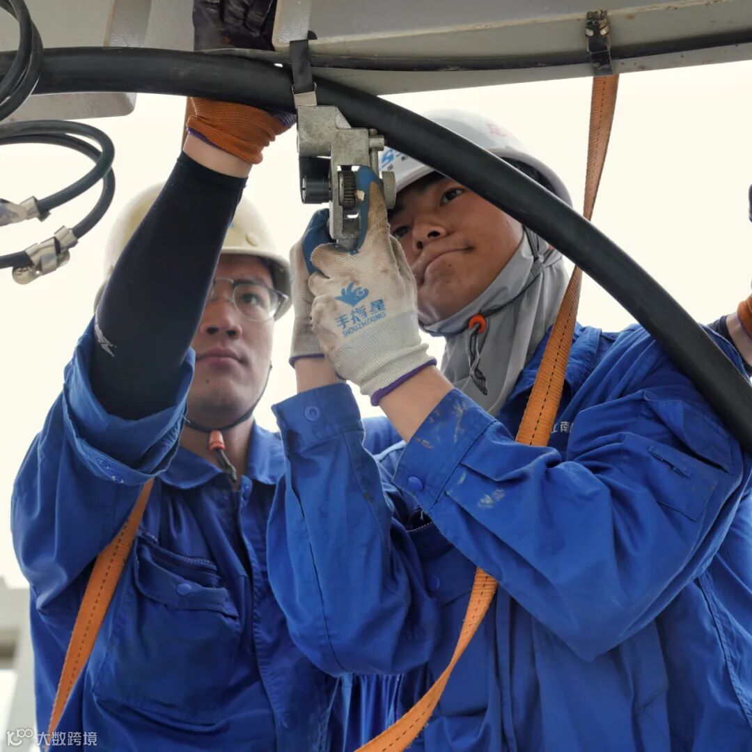 总装部电装作业五区李文乐、李振在进行绑扎桥上冷藏电缆的敷设及绑扎