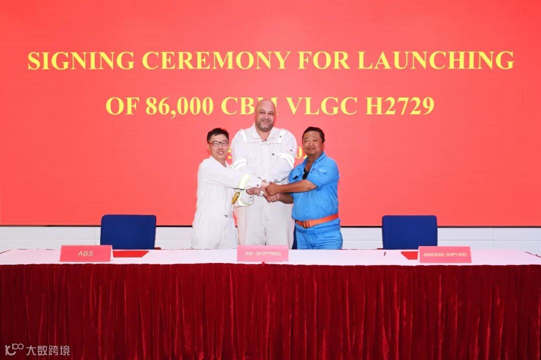 今天上午,公司为天津西南海运建造的98000立方米VLEC及为AW SHIPPING LIMITED建造的86000立方米VLGC先后出坞,船东建造组及公司相关项目建造团队出席仪式。2船出坞后,2艘86000立方米VLGC半船及1个24000箱超大型集装箱船环段进行起浮移位。