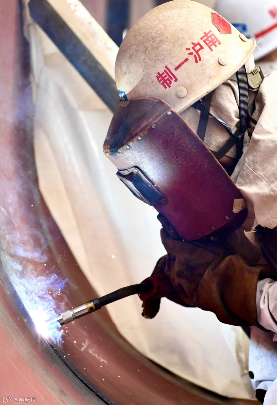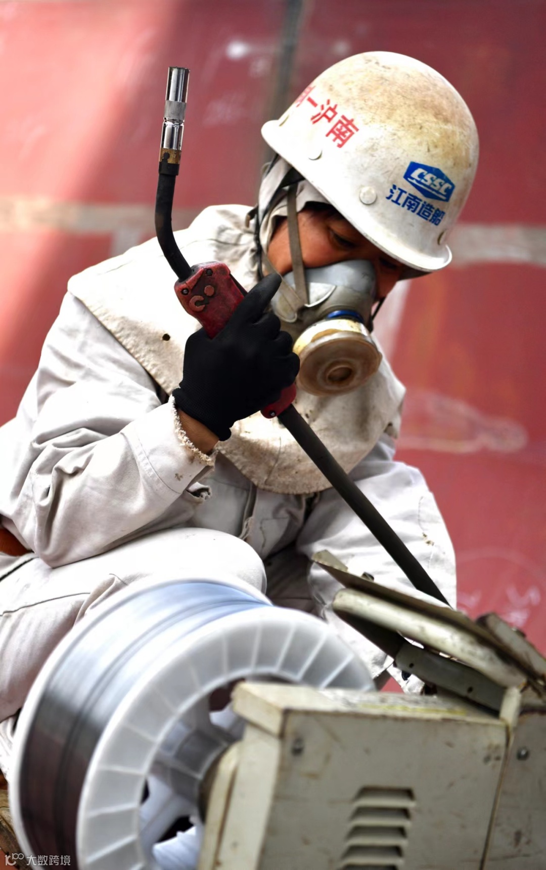 7月份的生产现场被热浪簇拥,直射的骄阳让人睁不开眼睛。登上正在建造的双燃料超大型气体船的分段,头顶虽有移动风雨棚遮蔽,但是钢板仍然滚烫。分段上忙碌的焊接工人在钢板和焊花的双重炙烤下,黝黑的脸庞上挂满了汗珠,安全帽外的头发也因沾上汗水黏在了脸上。