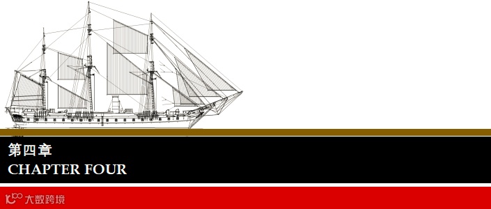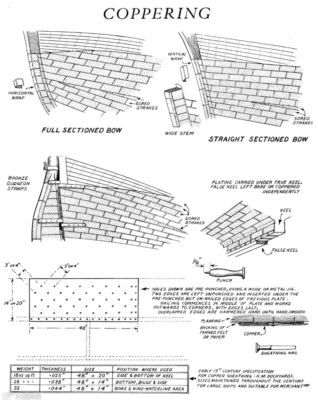 从图4-18中还可以看出,对于曲线形和直线形艏柱采用了不同包覆方式,曲线形艏柱采用水平包覆(Horizontal Wrap)、直线形艏柱采用垂直包覆(Vertical Wrap)。每片铜板安装前是预先打孔的(Pre-punched),钉钉子的程序是从板的中心向四个角扩展。被相邻板叠压(Overlapped)的两条边暂时不打孔。重叠的边要用榔头敲击至平顺。为了防止产生电化腐蚀,铜板的下方衬一层油毛毡(Tarred Paper),钉子上也有护套(Sheathing Nail)。