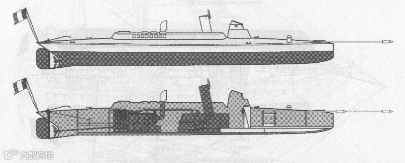 45、46号是一型特制的杆雷艇,艇长接近27米,又被称为“27米型杆雷艇”,艇型接近小型鱼雷艇(图4-7b)〔注3〕。1885年2月14日,中法石浦海战中,法军采用蒸汽舢板改装的杆雷艇突袭了“驭远”舰。这种改装的杆雷艇更加接近传统意义上的杆雷艇(图4-7a)。