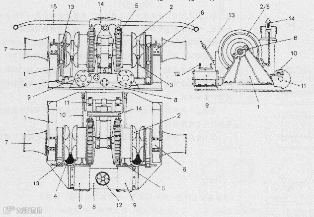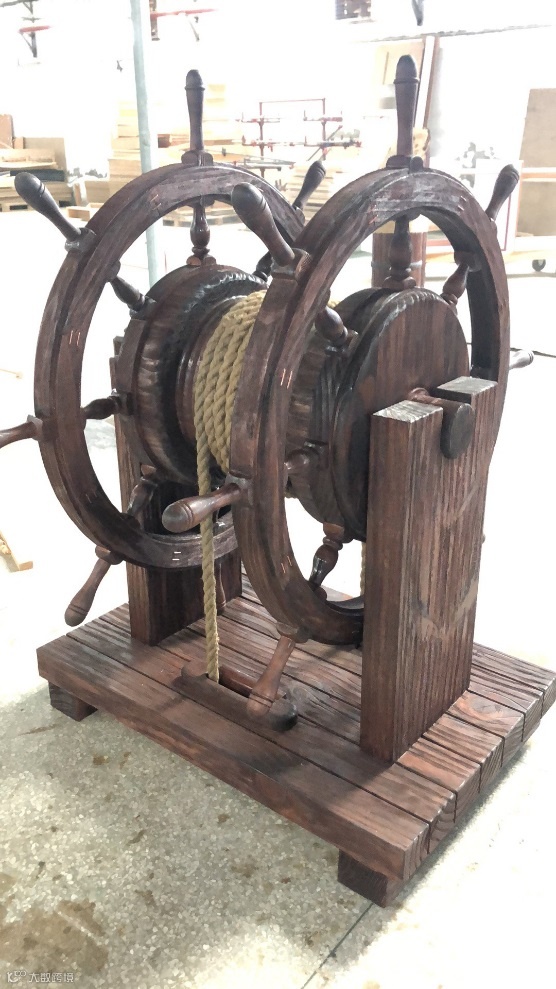 在风帆船上,绞盘是一个十分重要的设备,可用于起锚、收揽、升起帆桁以及收放小艇。这些绞盘通过绞盘棒插入绞盘上的孔由人力推动旋转进行各种作业,参见图4-9。在一些大型风帆战舰上特别是全帆装的战舰,通常根据不同的用途配置多台绞盘,有些绞盘为双甲板串联绞盘(图4-11),可以通过增加最多一倍的人员进行大负荷操作。在19世纪早期的船上,还有配备一些卧式的泵式绞车。按照风帆船的设计惯例,像“海安”号这样的全帆装大舰,至少应该配置三台大型立式绞盘。