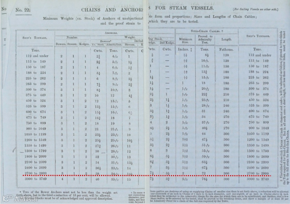在英国劳氏船级社中国公司的朋友帮助下在劳氏伦敦总部找到了1850年、1869年和1870年三本劳氏船级社的规范的复印件。笔者仔细翻阅了这三本规范,1869年和1870年两本规范的正文基本相同,没有明显的差异。根据“海安”号舰建成下水的日期,这两本规范是主要查找对象。1869年的劳氏规范中的表格No.22分别明确列出了风帆动力船和蒸汽动力船的锚索和锚的尺度和数量要求(图4-19)。