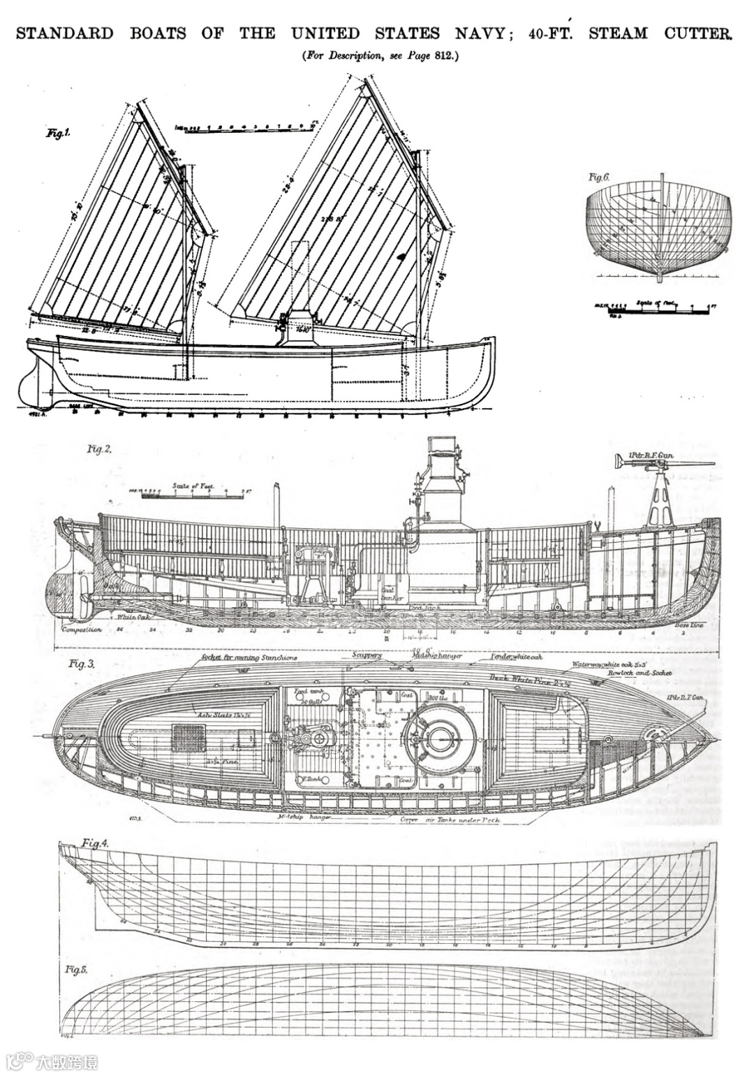 蒸汽动力小艇通常设计成流线型船体,船体线型和现代船艇的船体线型相比并不特殊。从小艇的总布置来看,这些小艇通常在艇舯部布置机舱,内置一台小型的蒸汽机和烟囱,机舱的前部是乘客或军官的座位,机舱的后部是操舵水手和划船水手的座位,尾部配置有一具螺旋桨和舵。有些艇上还配置桅杆和帆装,有些艇还在艇的艏部配置了一门小口径的火炮。参见图4-4 美国海军标准型艇:40英尺蒸汽舢板,图中的小艇配置了一门1磅口径的线膛速射炮(1 pdr R. F. Gun)。