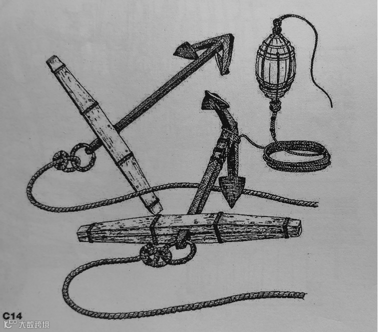 四个首锚(海军锚)、一个尾锚、一个小锚和锚链以及四个吊锚架等等; -