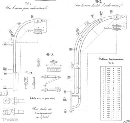 如本章前文所述,风帆战舰上通常带有多艘小艇,主要用于港内和登陆时的人员输送和物资补给、船与船、分舰队之间的联络和输送等等。据史料记载,“海安”号舰共购置了八艘小艇。在一艘较大的艇上,还配置了一台5马力的立式蒸汽机,有三艘大艇配置了一门12磅的前膛炮,用于偷袭、护卫和小规模的战斗。在16世纪,这些艇往往存放在上甲板通风格栅的艇架上,用前桅上斜帆桁从甲板上存放位置吊放到水面或从水面吊放到甲板上存放位置。到了18世纪,出现了专用吊艇架,小型的艇通常挂在吊艇架上,而大型的艇则仍然存放在上甲板通风格栅的艇架上或航行时拖在大船的后面。开始这些艇架是木质的,后来制铁技术的发展,出现了铁制吊艇架(图4-12)。