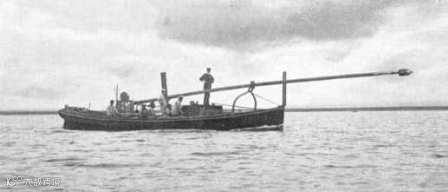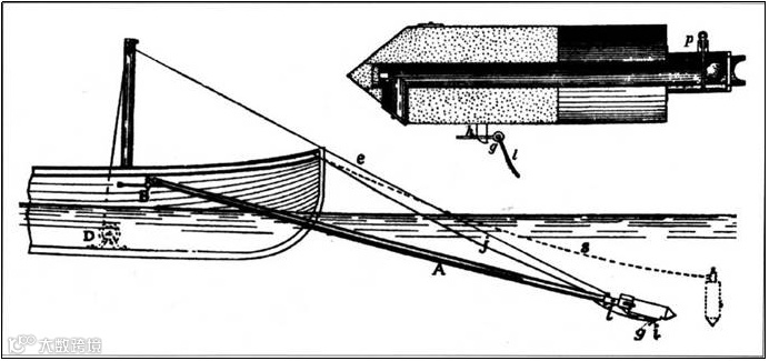 除了在舰载舢板上安装火炮以外,通常在军舰上的蒸汽动力小艇还可以加装杆雷,变成用于近战抵近攻击的杆雷艇(Spar-Torpedo Boat)。杆雷(Spar-Torpedo)是最早具有实战价值的水下进攻型武器,杆雷通常带有两个由湿火棉(Wet Guncotton,即硝化纤维)制成的战斗部。杆雷绑在一根长达30到40英尺的长杆上,由电击发器控制引爆,如图4-6所示。这根长杆固定在舰载舢板上,平时航渡时是不插入水中的,当接近目标时,才把杆斜插入水中约6英尺。图4-7a为航行中的杆雷艇。〔注1〕