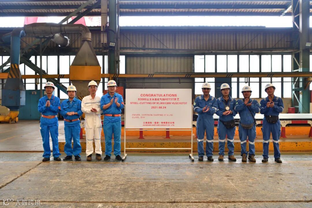 同日,中国船舶集团旗下江南造船为Petredec Holdings (Eastern) PTE Ltd (以下简称Petredec公司) 建造的93000立方米超大型液化气运输船(VLGC)H2737在制造二部第五切割跨间举行开工仪式。船东监造组代表Kumar、 DNV船级社代表刘云、江南造船该船总建造师魏小勇在开工节点证书上签字。